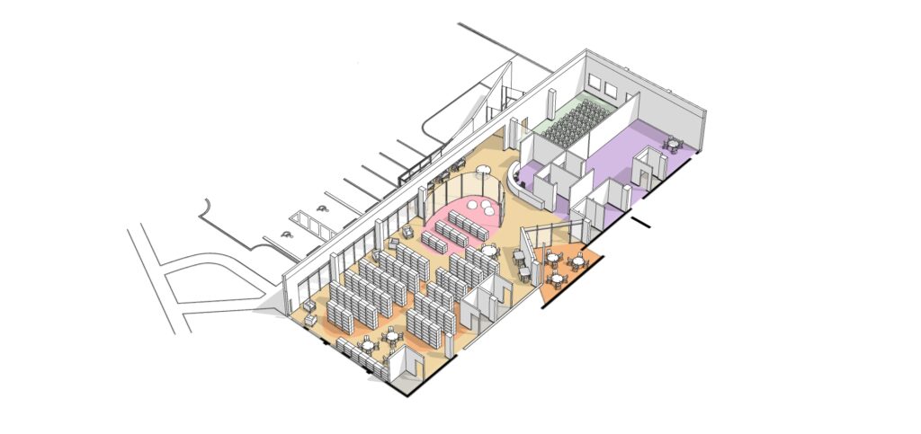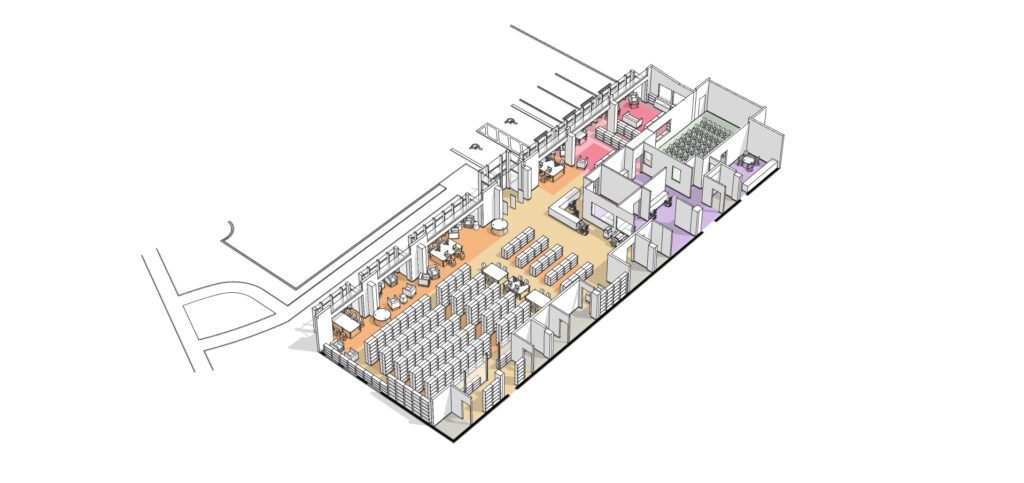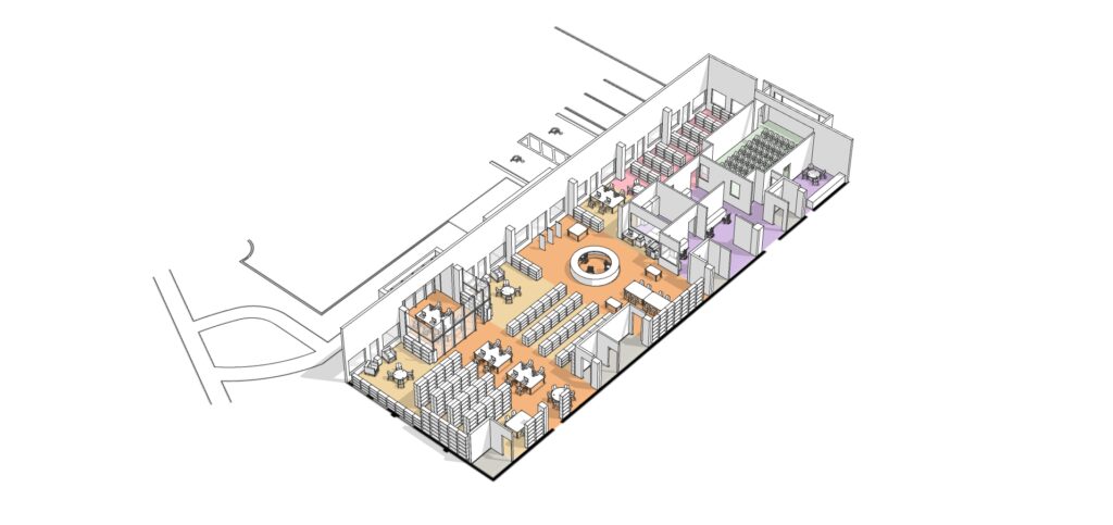 We developed the following overview of challenges and opportunities for the library. Each of the resulting design options were synthesized into a schematic plan and axon that proposed an entirely new approach to the configuration of the library’s main floor. Riverdale Branch Library will refer to these options during future planning discussions about the future of their library.