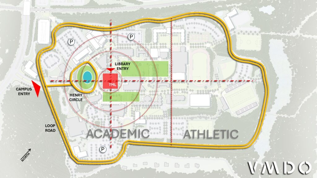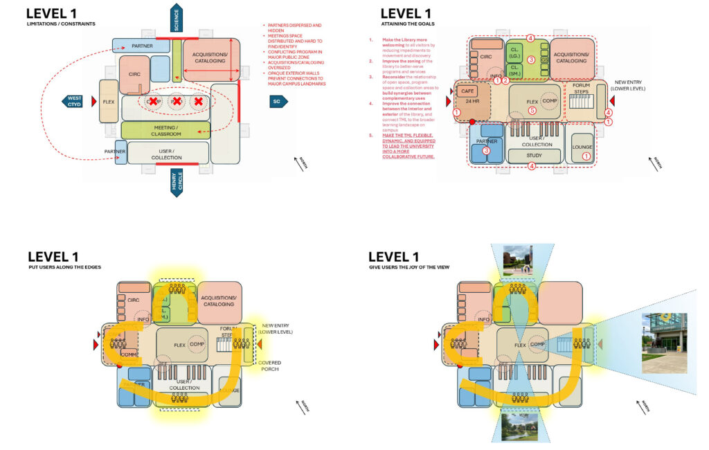 The results of our exchange were at once adventurous and measured. It was established at the outset that a menu of design ideas needed to be created that would allow Bowie State to weigh a range of opportunities, all with an eye to improving efficiency, enhancing current strengths, and making the building feel more like the accessible academic hub it is for all students, whether they are enrolled full-time or study at night, they are a commuter or residential student, or whether they are a first-year, first generation student or a graduate student from overseas. The speculative nature of the collaboration lent itself to both imminently practical short-term solutions and more daring proposals that would completely re-envision the TML.