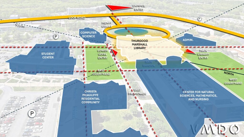 Recently, VMDO had an opportunity to collaborate with one such librarian: Dean Sophia Sotilleo of the University of Maryland’s Bowie State University, the state’s oldest HBCU. Working through the sponsorship of the Library Journal, and in conjunction with The Journal’s Design Institute hosted in Cincinnati Ohio in October, VMDO assisted Dean Sotilleo and her staff in a design exercise that focused on improving the institution’s Thurgood Marshall Library, the flagship academic building on the BSU campus. Through a series of community engagement workshops, the goals for improving the library took shape: to make the library more welcoming to students, to improve the zoning of the library to facilitate multiple simultaneous events, to build synergies between complementary programs distributed across the 167,000sf library, and to improve the connection between the interior of the library and the beautiful campus landscapes that envelop it.