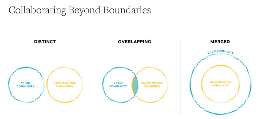 Fostering destinations for collaboration. One of 7 districts or “destination areas” identified for development in Virginia Tech’s 2047 Beyond Boundaries Master Plan, the CID is envisioned as a “vibrant ecosystem that melds the exploration of innovative technologies and the design of creative experiences with best practices for developing impact-driven outcomes.”