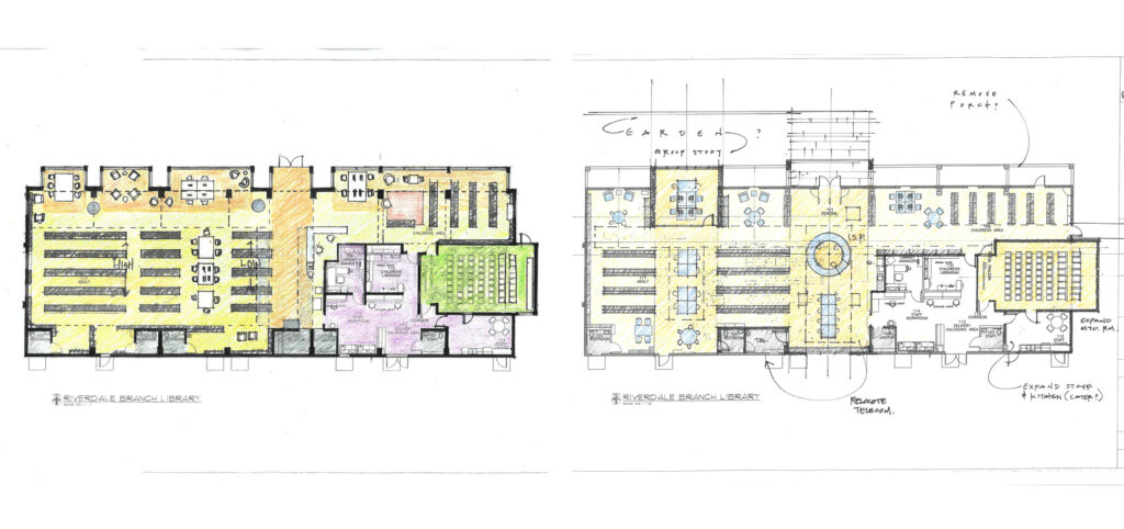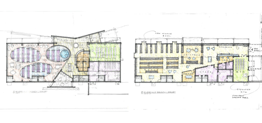 Working with the Riverdale Branch Public Library (Fort Myers, FL), we developed a range of design solutions that focused on making efficient use of a limited amount of space. Collection size and storage, meeting and study space, improved staff accommodations and enhanced curb appeal all factored into the development of four strategies that range in cost, operational impact, and balance between user space and capacity to house resources. By reducing the footprint of the collection and strategically expanding the area of the building in key locations we managed to strike a balance between the needed resources and the desire to prioritize spaces for patrons. The designs consolidated bookshelves deep within the exterior and positioned gathering, study and reading spaces to the perimeter of the building, where they could benefit from natural light and views to the surrounding landscape.