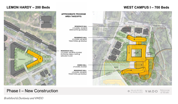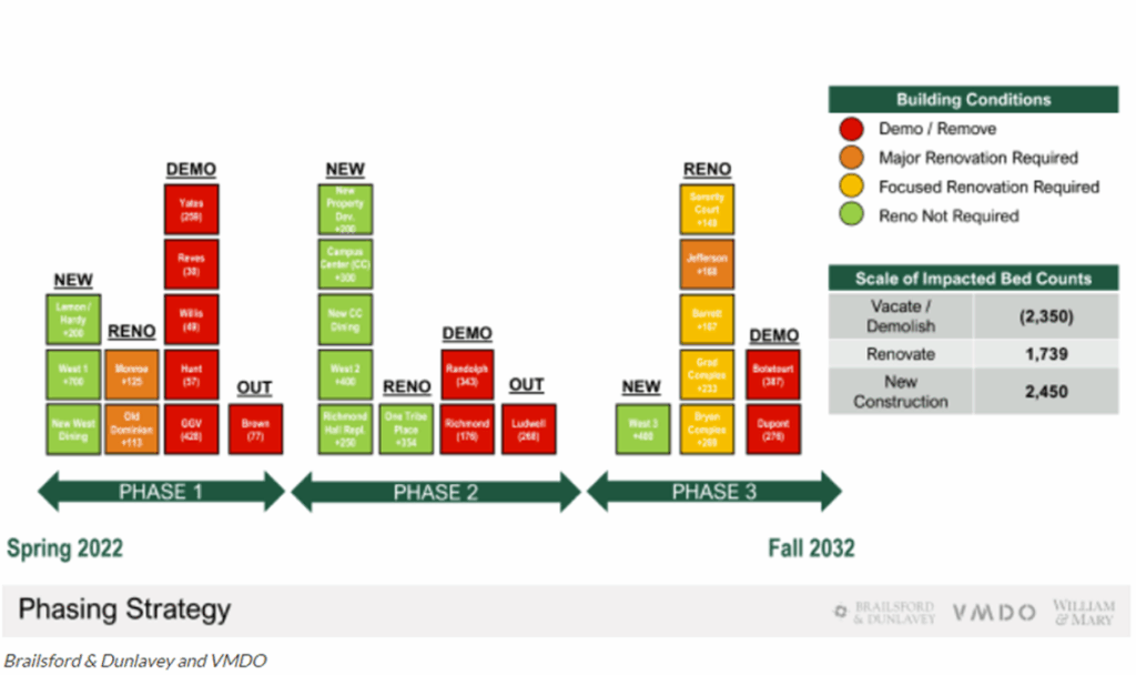 The project is split into three phases with each phase addressing different locations and buildings on campus. Over the course of this effort, William & Mary will increase the percentage of beds with air conditioning from 42% to 100%. Meanwhile, the average age of housing facilities will drop from 54 to 10, the number of individual residential halls will drop from 70 to 55, and the number of beds will remain constant at 5,000.