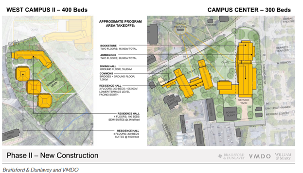 The plan is developed in three phases and includes renovation and new construction to either improve or replace all of the university’s outdated facilities. New construction is focused primarily on two precincts of campus. West Campus Housing and Dining envisions 1000 new beds and a new residential dining hall to replace the existing Yates Hall, the Randolph Complex, and the Commons Dining Hall.The site plan will integrate the new complex into the existing landscape, connecting to important campus pathways and celebrating views of and spatial connections to the West Woods. New construction at the Campus Center will fundamentally transform the gateway experience of the William & Mary campus. By replacing the existing Campus Center and several surrounding buildings, the university will create a welcoming new entry experience for students and visitors alike. Finally, 200 beds of new housing will complete an existing quad at Lemon and Hardy Halls.
