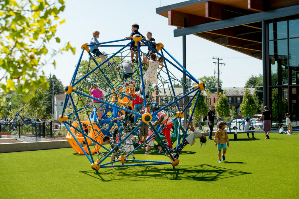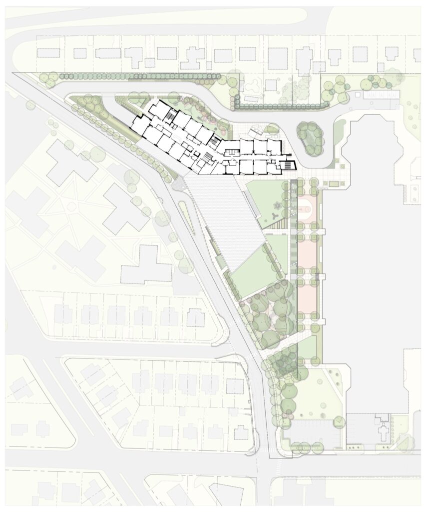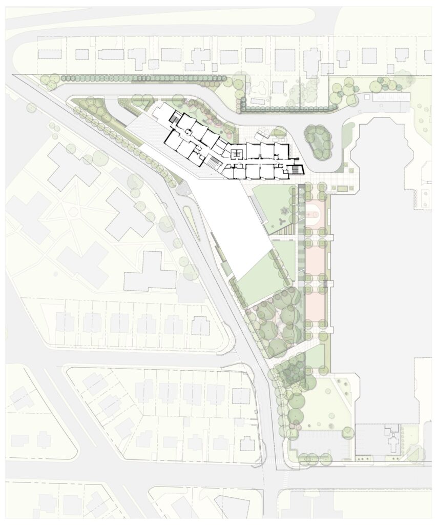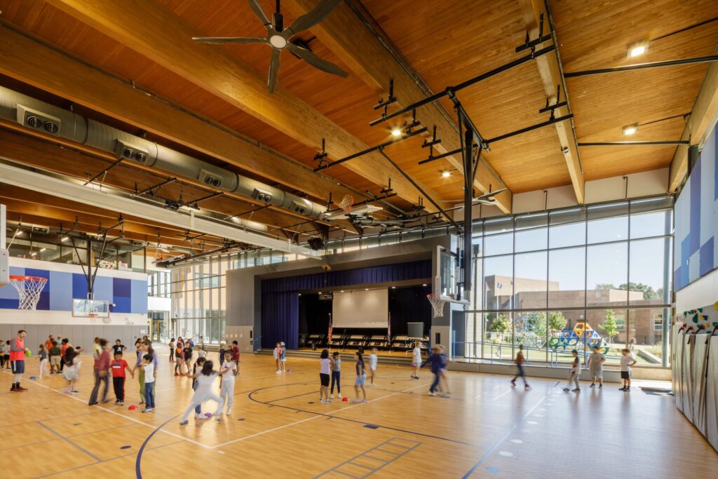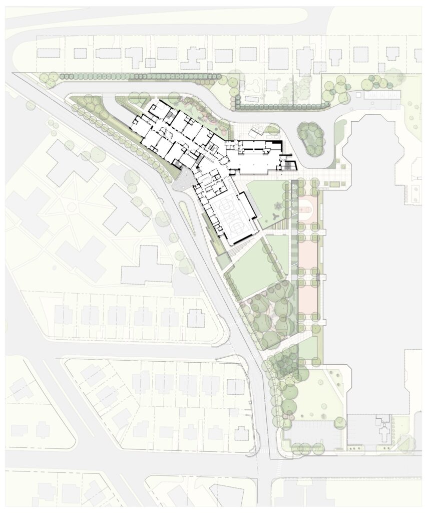 Despite its compact footprint, the ground floor still accommodates a full-sized gymnasium, stage, dining commons, kitchen, administration, and all PreK and Kindergarten classrooms with direct access outside. Grades 1 and 2 are located on the second floor, grades 3 and 4 on the third floor, and the 5th grade is on a smaller fourth floor. The building “steps back” as it “goes up”, placing the 4th story closest to the center of the site and as far away from houses as possible. Under the building, a podium of structured parking for 228 vehicles preserves green space for the community.