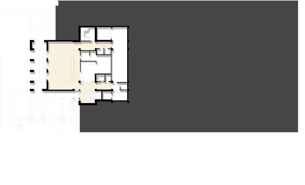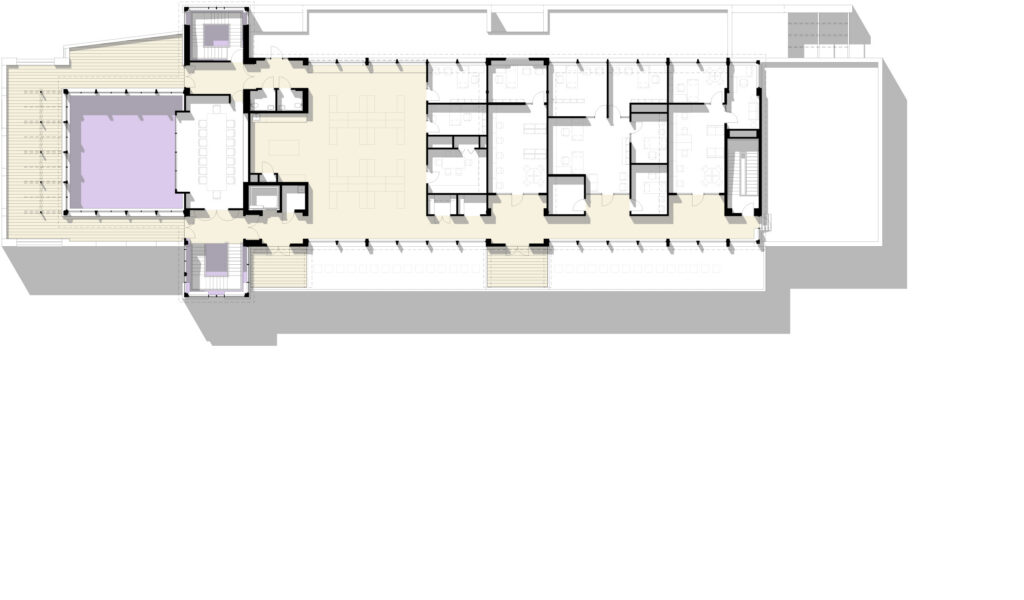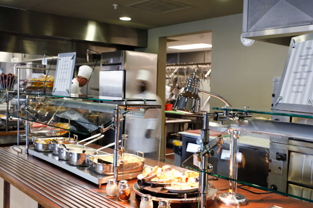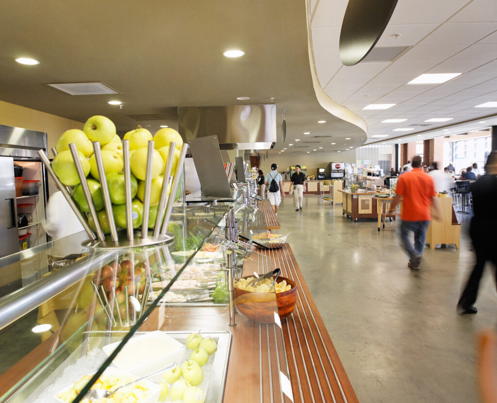 The Student Center contains amenities on four levels, including a coffee shop, convenience store, game room, TV room, and computer lab. The building also features a central dining facility, which features a 300-seat, multi-purpose, state-of-the-art “performance kitchen” and other dining spaces, such as an outdoor patio with cafe tables and a rooftop terrace.