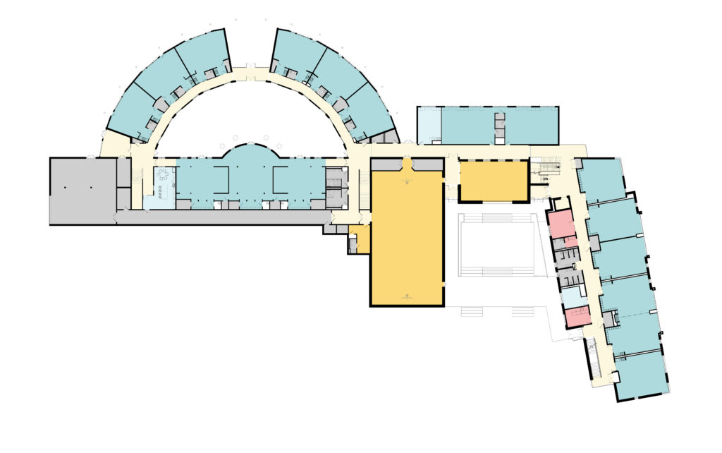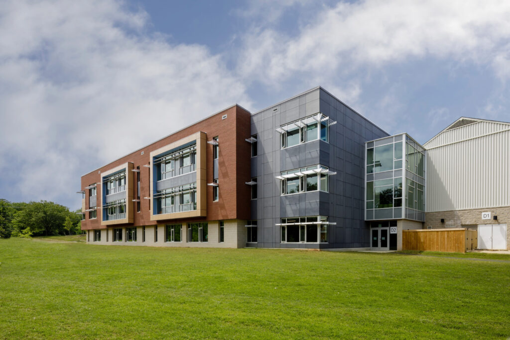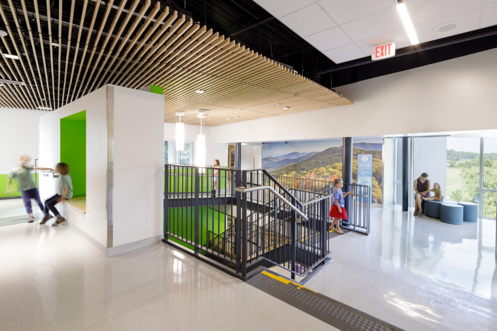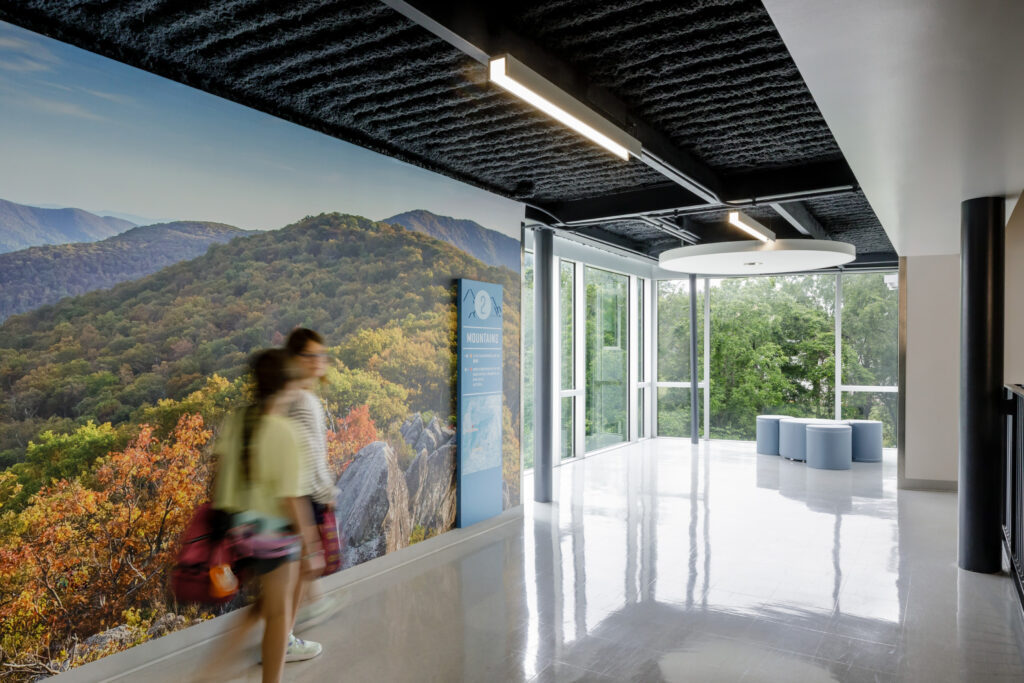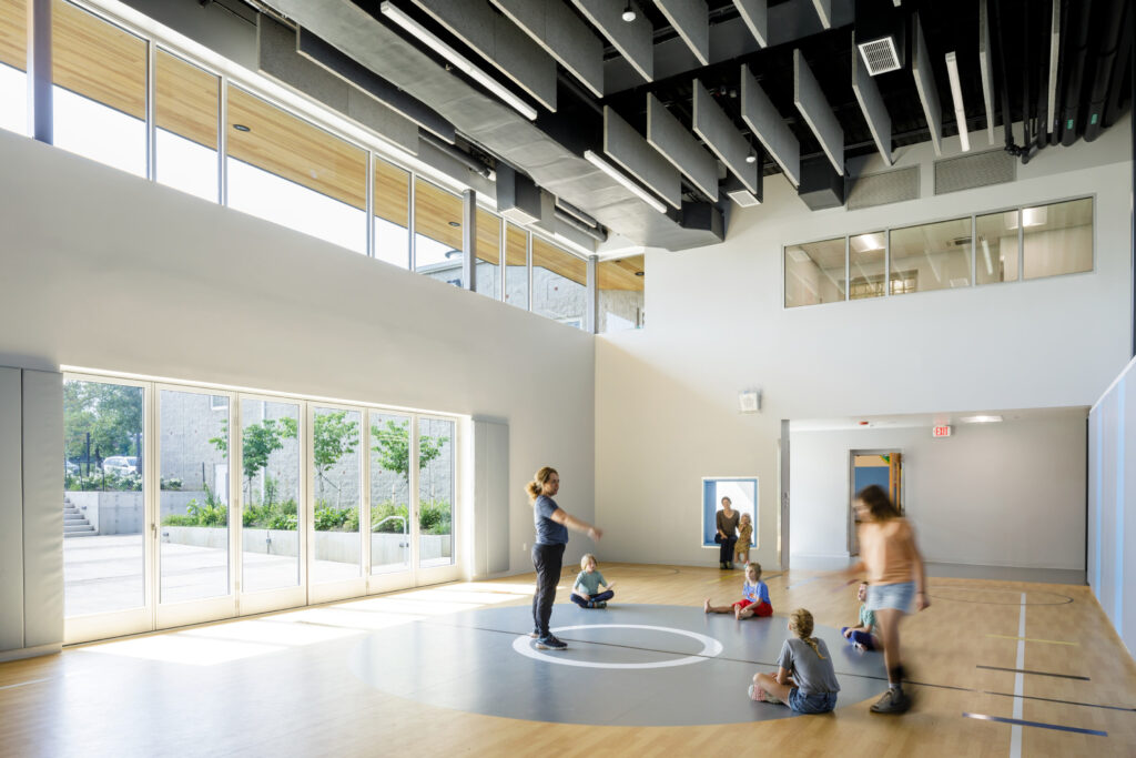 The 2021 renovation is comprised of two separation additions that include new classrooms, offices, faculty workrooms, a movement room, expansions to the cafeteria/kitchen, and various support spaces. The new three-story Learning Wing is nestled into the hillside beside the original building to preserve the existing classrooms’ pastoral views. The height of the addition aligns with the height of the existing building, and the lowest level opens to the adjacent woodland creek.