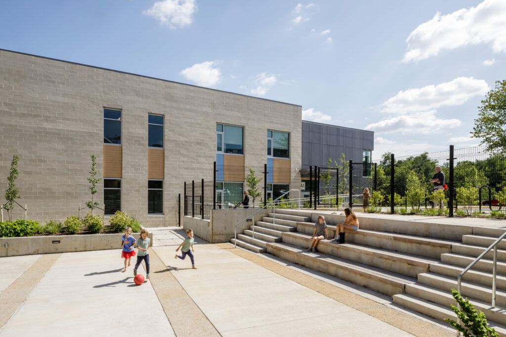 Additional parking and a more accessible plaza are provided at the main entrance along with a new dedicated bus loop on the north side of the school. Between the new classroom and existing school, designers have created a new landscaped courtyard with an outdoor stage and seating steps. Lastly, an expanded outdoor playground, rain garden and walking track thoughtfully occupy formerly underutilized space between the school and athletic field.
