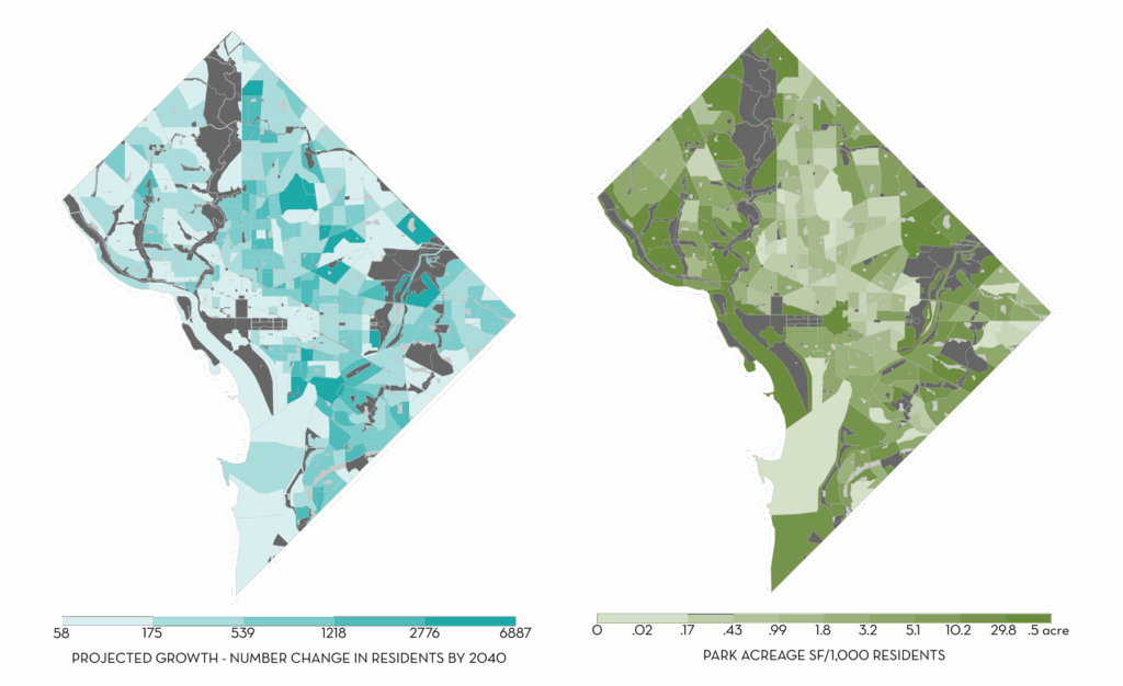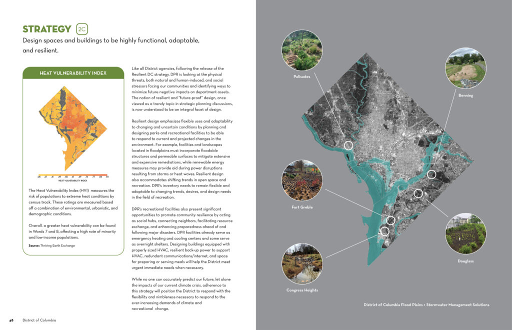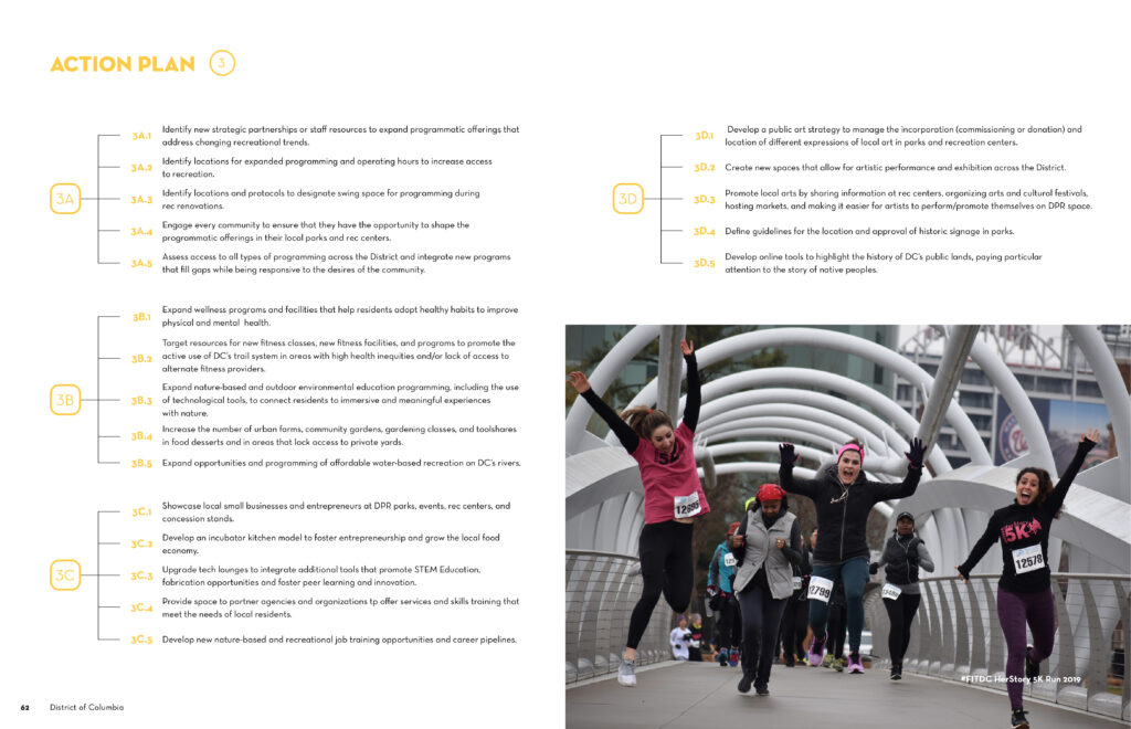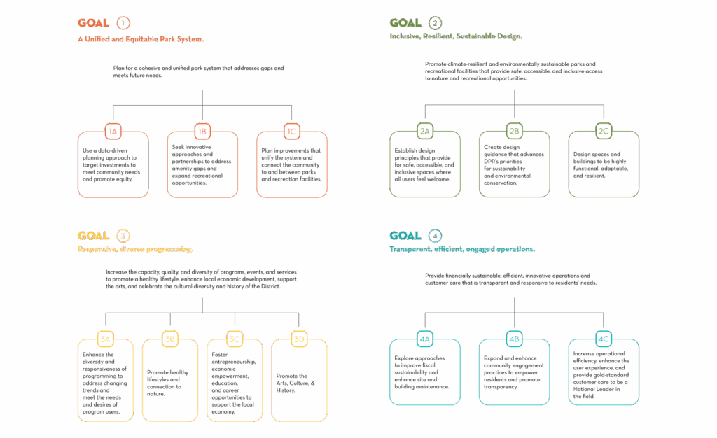 The community engagement process established clear goals for park space across the District and helped to chart a bold path forward for planning, design, programming, and operations for the next two decades. A Strategic Action Plan provided dozens of on-the-ground strategies to be implemented on individual sites. A corresponding Equity Framework is intended to serve as a guide to identify and prioritize initiatives, capital projects, and programs to pursue in response to present and future needs.