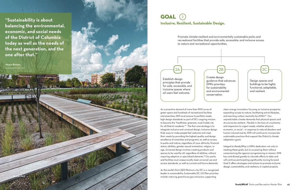 The Ready2Play Master Plan forms a strategic vision for the future of DC Parks and Recreation, with actionable strategies to enhance sustainability, equity, and public health goals across the District over the next twenty years.