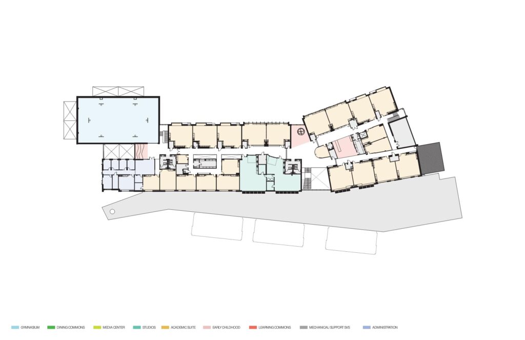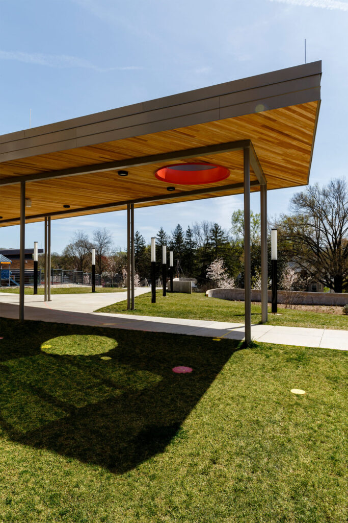 The school’s design takes advantage of the topography of the site to create distinct academic zones and separate exterior play spaces for early childhood, primary, and elementary grade levels. Discovery’s public spaces are defined by a large roof canopy that runs the length of the school and serves as the school’s “front porch.” At the main entry, the roof extends out as a canopy with an oculus, which allows the entry plaza to serve as a large solar calendar that indicates both time of day and time of year.