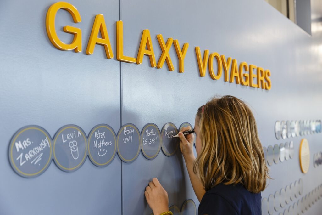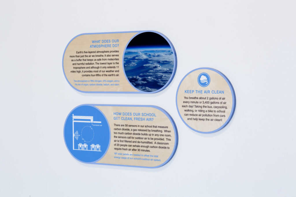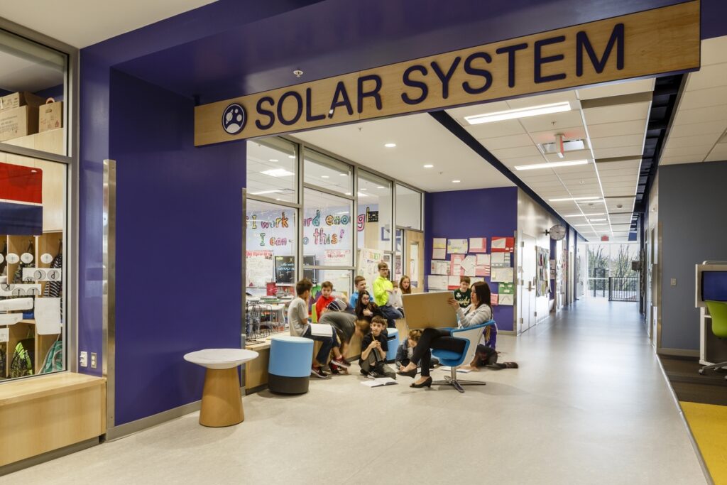 The school’s wayfinding goes beyond basic navigation to support a larger vision of spatial organization that reflects each grade’s expanding curriculum and identity. As students progress through the school, their “world expands” from the scale of the backyard to the galaxy.