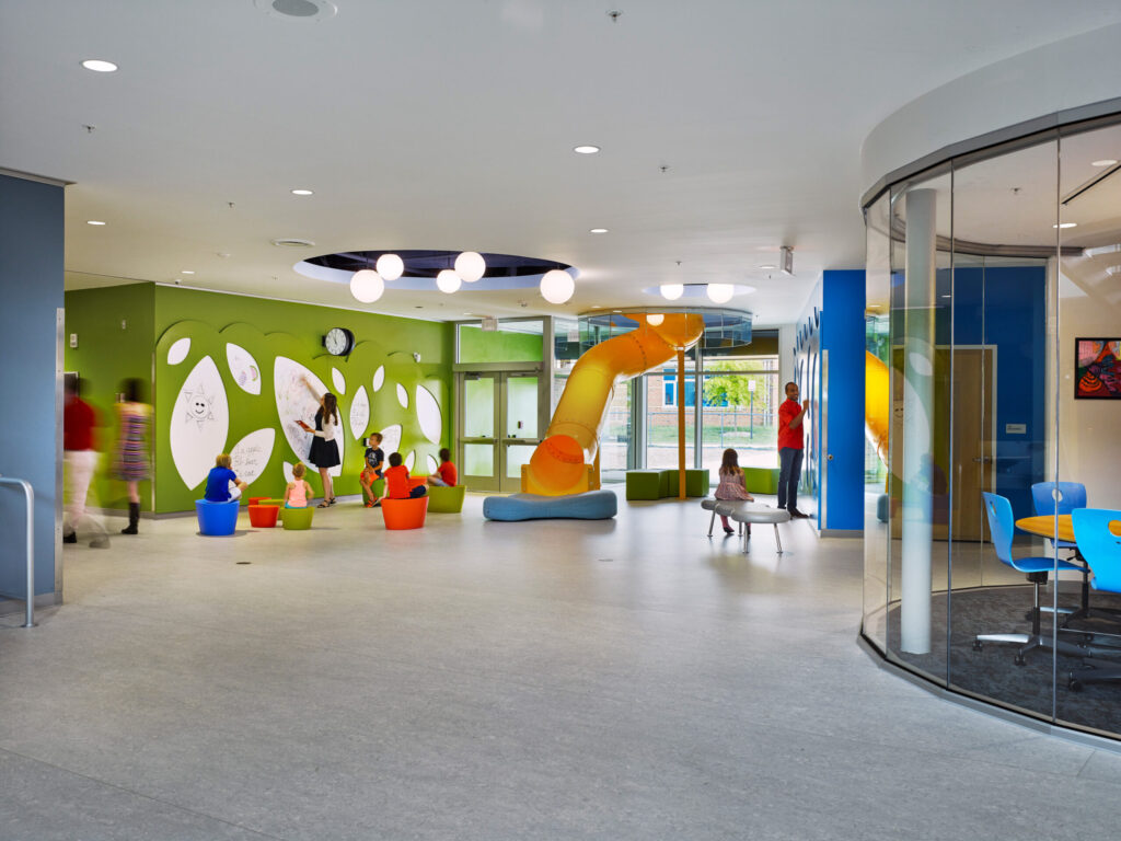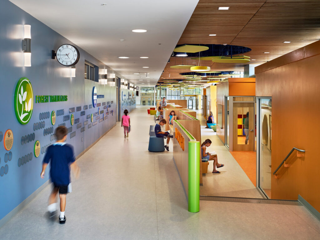 Discovery Elementary School is Arlington Public Schools’ first elementary school designed in the 21st century. Designed to address rapidly growing student enrollment in Arlington, the school has set new standards for high-performance buildings and engaging school environments. The school is built into an existing hill to minimize the perception of its size, and it features exterior materials that complement the adjacent neighborhood context.