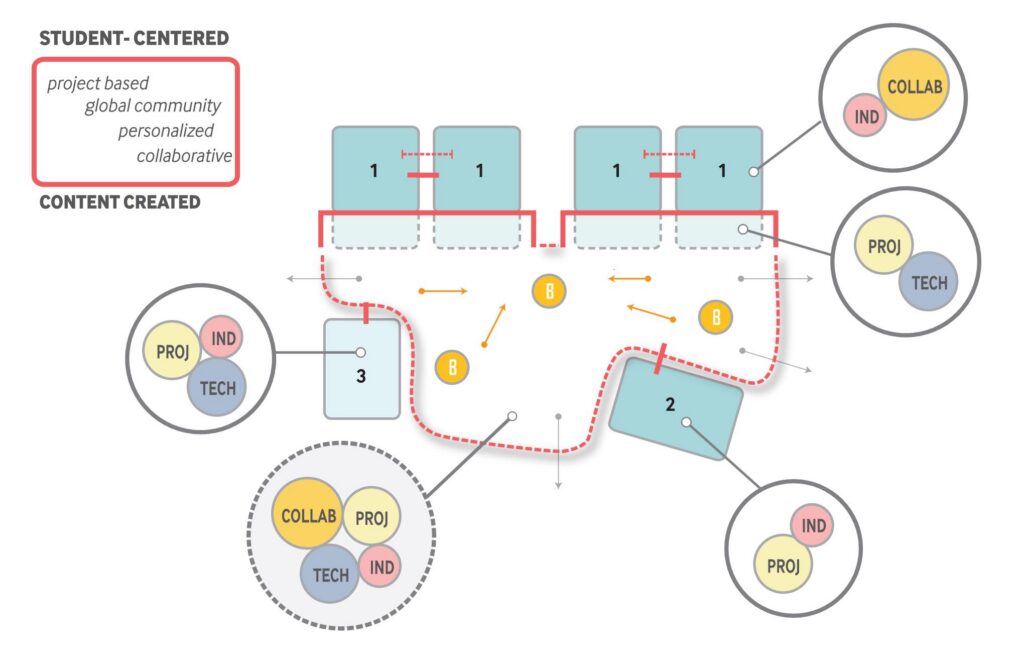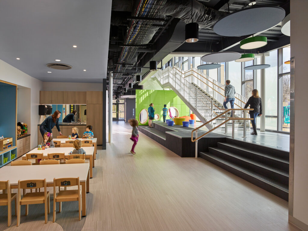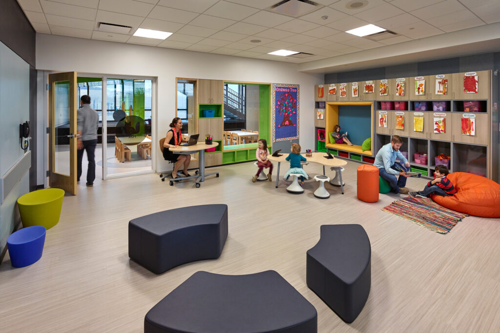 With these objectives in mind, learning neighborhoods were designed to provide paired studios, connected to community entourage spaces for dining, art, and gathering, and supported by professional spaces, a range of outdoor playspaces, and active areas like the “Leap Lab” and “Hoot Hub” that encourage movement and literacy,