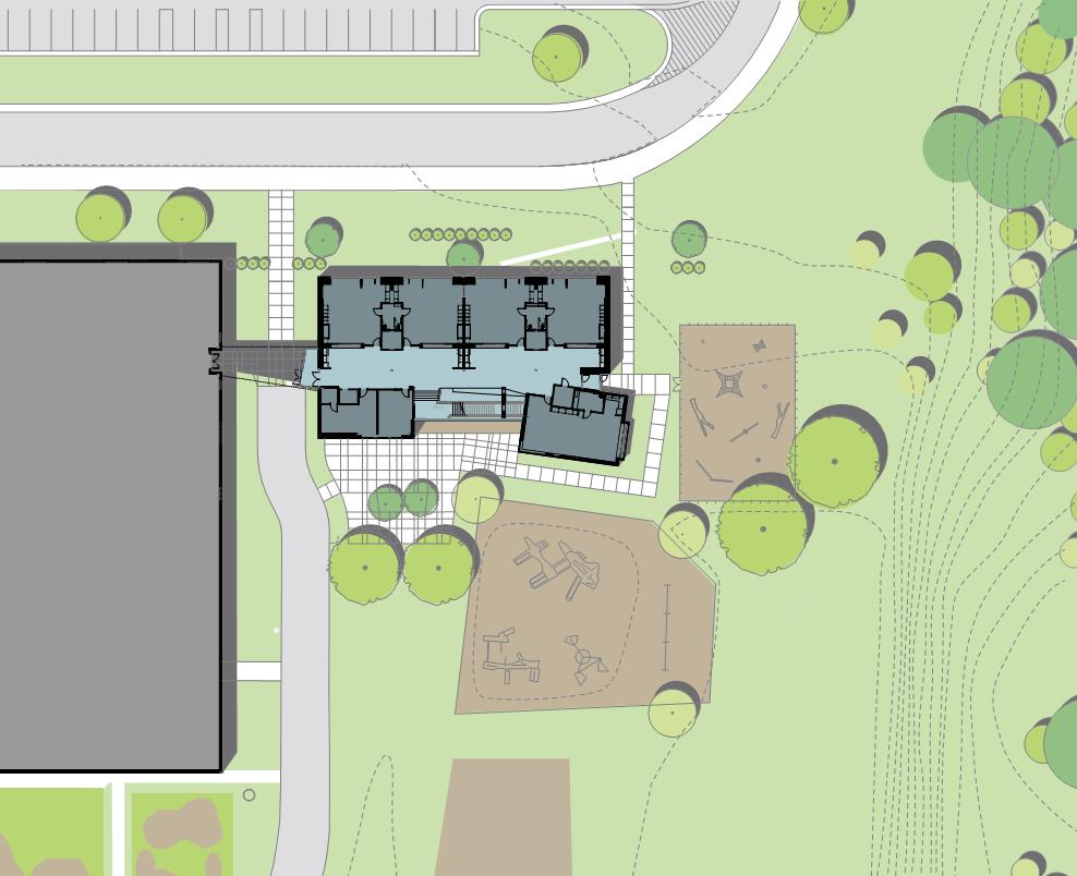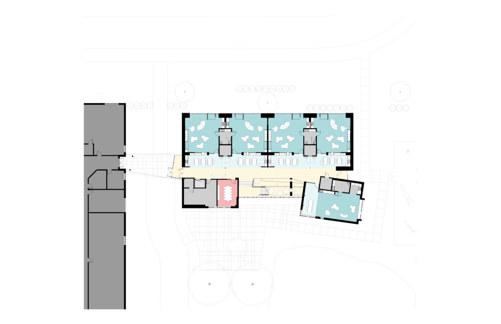 The two-story ELC consists of learning studios and support spaces anchored to a central promenade that acts as a community hearth for dining and hands-on learning. Communal ‘entourage’ areas engage circulation outside the studios to foster community and diverse active spaces. Paired learning studios encourage community within the ELC and help early learning develop incremental connections to the surrounding school context. Interior environments are designed to foster optimal growth and development opportunities for exploration and learning while offering healthy connections to the outdoors. Play areas and a roof terrace support creative play, active movement, and focused inquiry.
