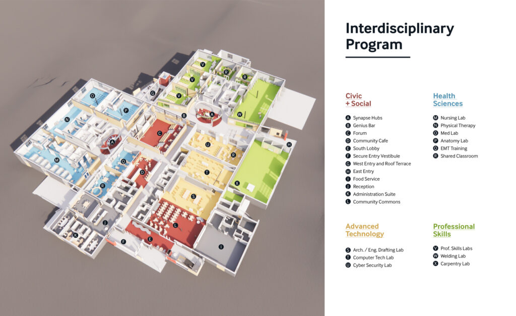 Designed in partnership with Reader + Swartz Architects, this building provides a new home for the CTE programs formerly housed at Handley High School. The Innovation Center is organized into three academies that equip students with skills and credentials needed for their future careers. The Professional Skills academy houses construction technique programs including labs for carpentry, welding, plumbing, mechanical, and electrical trades. Students in the Health Sciences academy gain skills related to nursing, occupational and physical therapy, and EMT in labs that emulate real-world hospital and clinical environments. The Advanced Technologies academy encourages innovation through programs dedicated to architectural drafting, design, and fabrication. The public zone, which includes small group hubs, a presentation forum, and a community café, fosters a sense of togetherness and facilitates opportunities for collaboration between CTE and academic competencies.