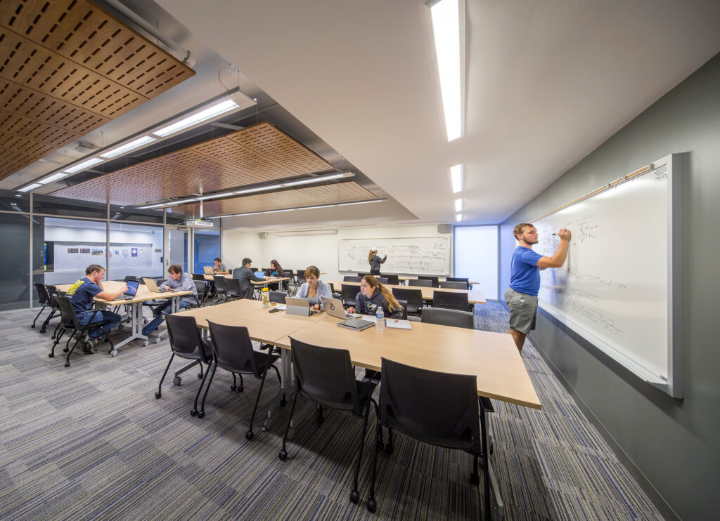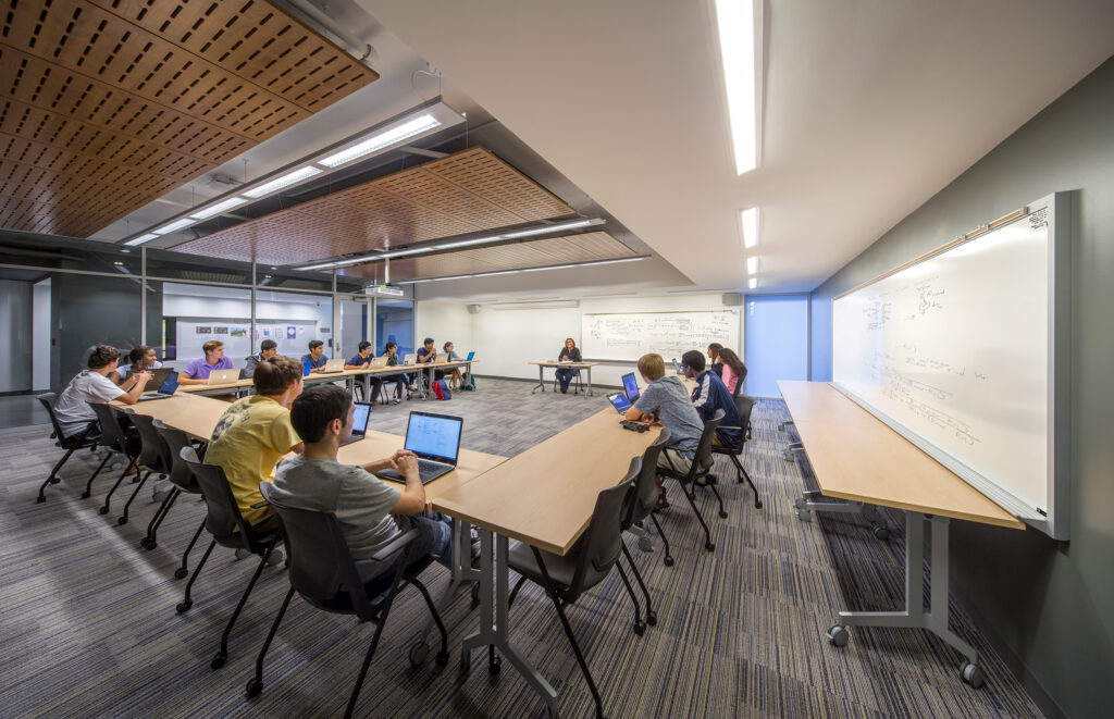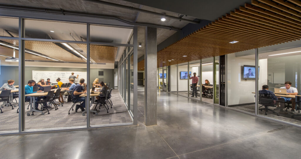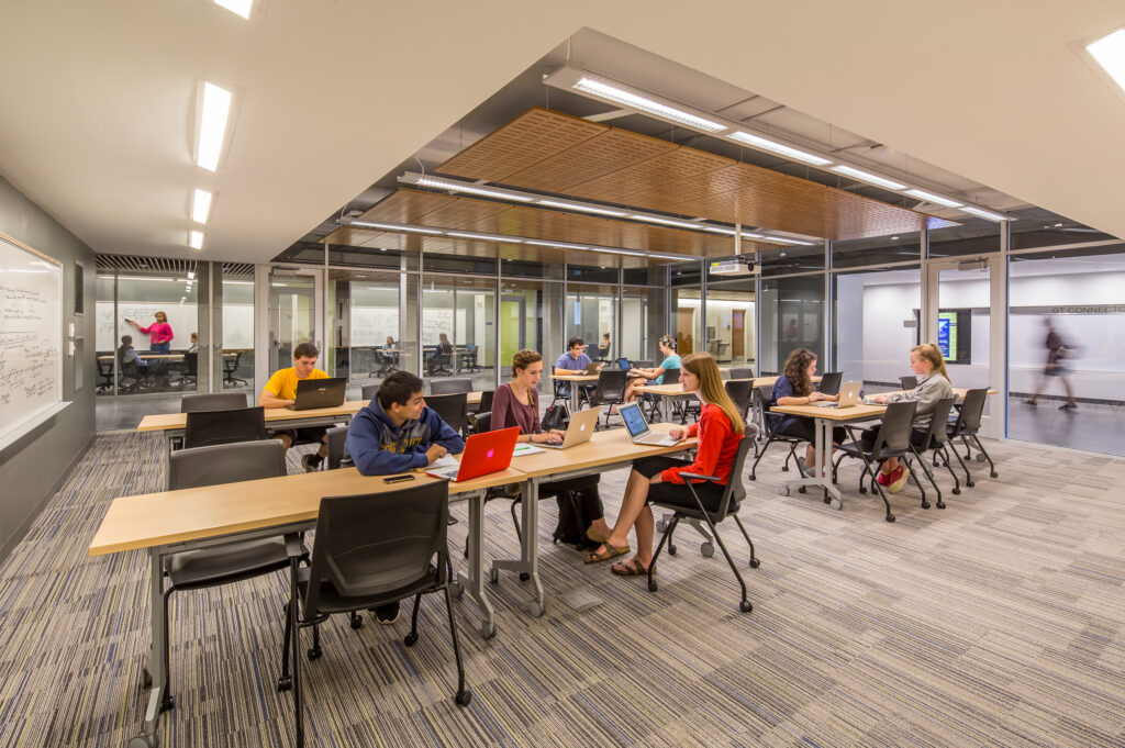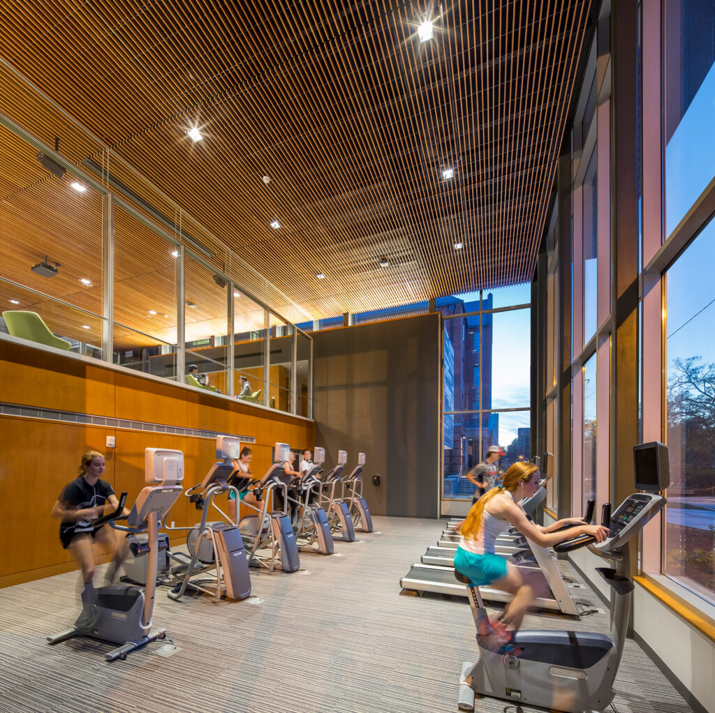 The design of the glass-wrapped connector building bridges the quad and street landscapes and showcases a multitude of student social and academic activities. The east-west circulation links living and learning programs and facilitates relationship building between residents. Students can safely traverse the residential complex and utilize the various public resources without leaving the security of the halls. Abundant transparency on the interior allows study rooms, classrooms, and fitness spaces to be visible from the central circulation spine. Flexible furnishings in the large lounge spaces contribute to an agile, lively, and comfortable atmosphere. The revitalized Glenn and Towers Residence Halls create a social hub on campus that fosters a lively student living and learning experience.