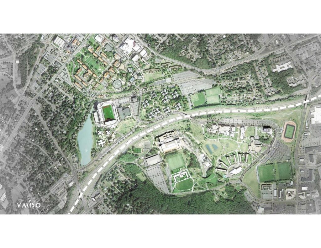 A destination for first- and second-year students, the newest residence hall at James Madison University adds activity and life to a growing section of East Campus. Jennings Residence Hall establishes important connections with the nearby University Recreation building and East Campus Dining Hall – tying together East Campus through a cohesive architectural language, improved views and landscape connections, and enhanced accessibility through a new land bridge.