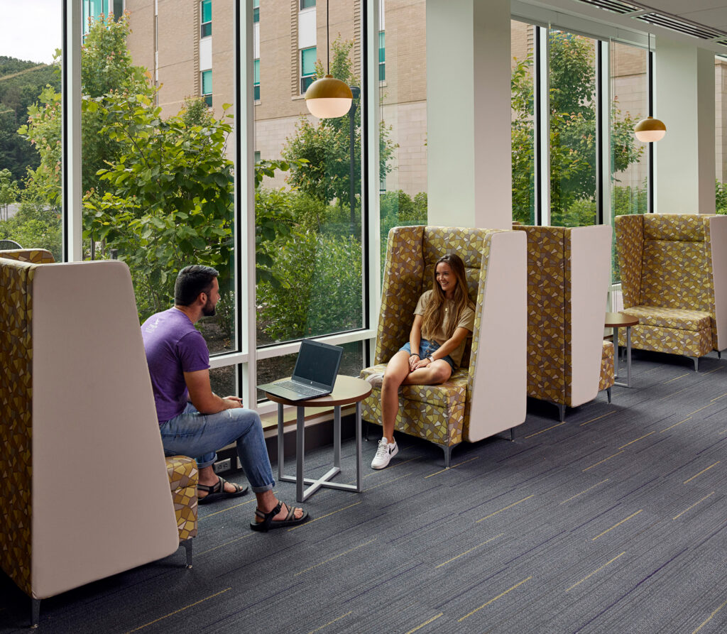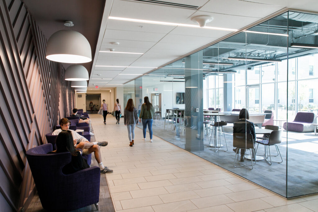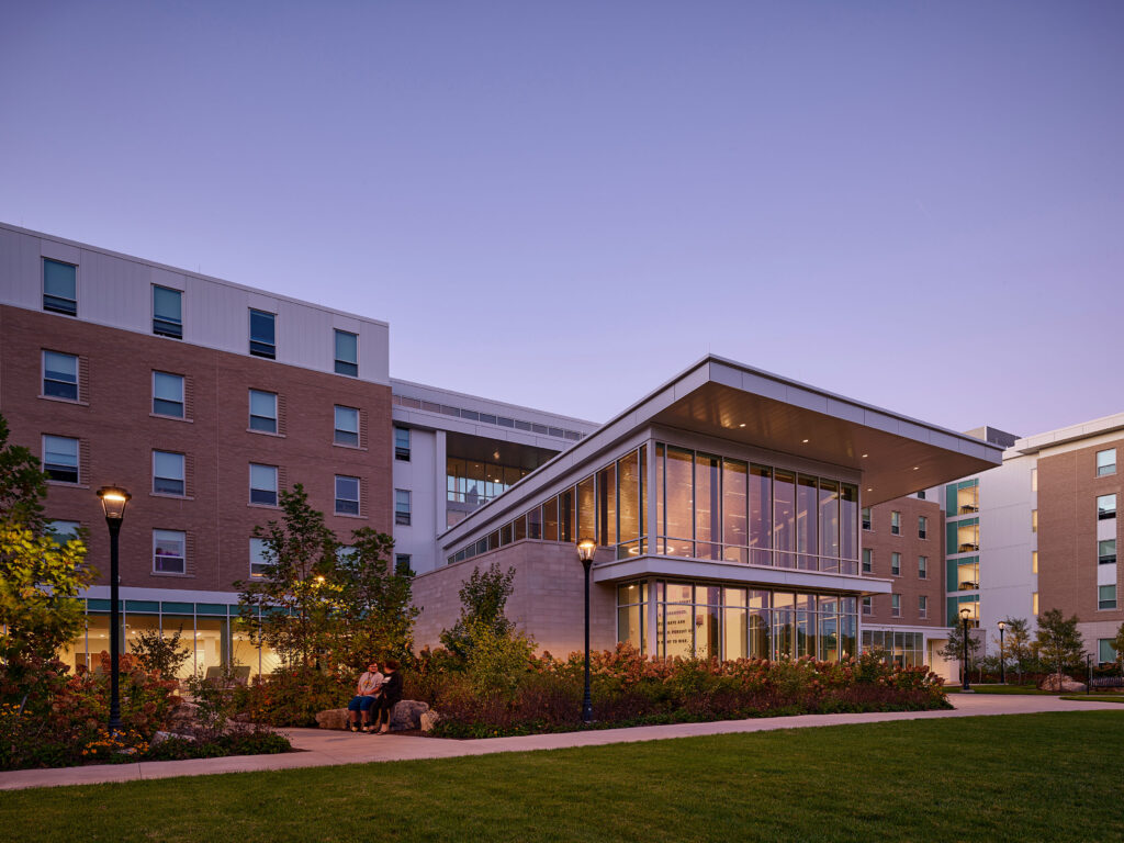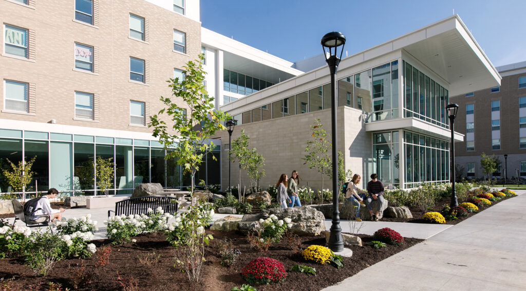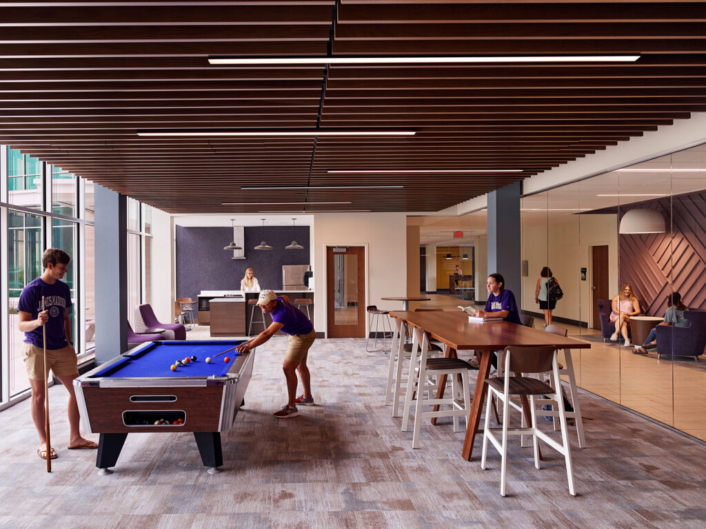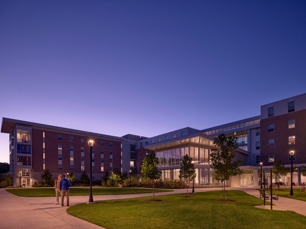 By pulling vibrant social and academic spaces into its residential setting, Jennings Hall gives students the flexibility to live, learn, gather, and play in one highly connected environment. Currently home to the Sports and Recreation Management Residential Learning Community, Jennings Hall’s diverse interior public space is complemented by an active landscape of accessible courtyards, recreation fields, and outdoor rooms that support a wide range of activities for all abilities. The building and landscape work together to create a place where students want to be year-round.