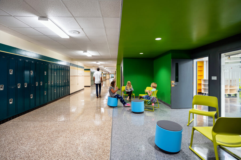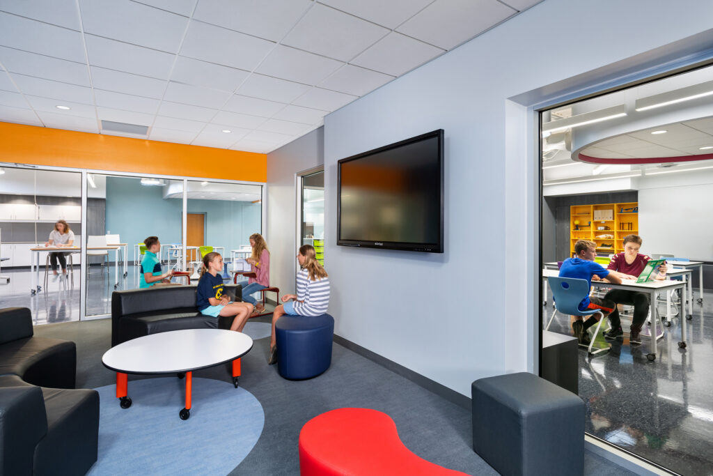 The modernization of the Journey and Walton Middle School Learning Labs transforms traditionally austere classrooms into vibrant, light-filled spaces that allow students to customize their learning experience through flexible arrangements and resources.