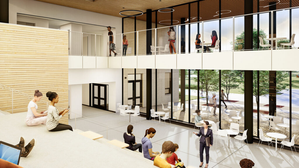 The facility nestles into its gently sloping context, placing public program along its northern street edge and academic program distributed in a 3-story bar to the south. The building is organized on a strong east/west axis, maximizing natural daylighting and visual connections to the site. The modular design of core academic areas provides a variety of space types distributed in each wing and on each floor, enhancing the building’s flexibility of use. Floor layouts also include several informal breakout spaces to provide additional moments for social interaction.