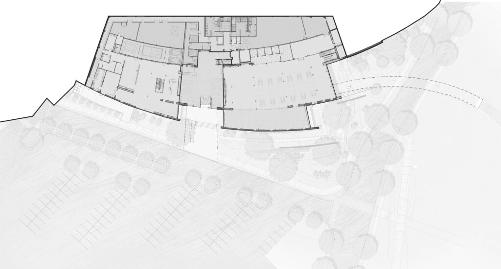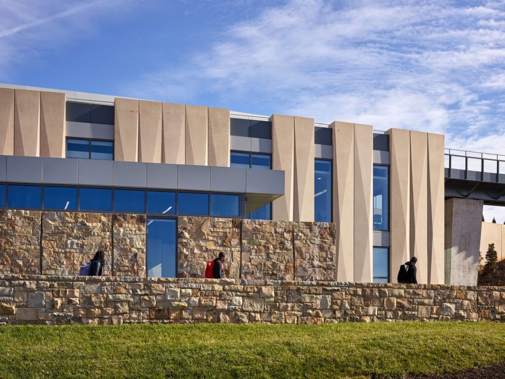 Built into an existing hill, the three-story building’s terraced form takes cues from the surrounding landscape. Terraces and elevated paths help pedestrians navigate around and through the building and connect the athletic and academic communities on campus. Large expanses of windows and transparency bring daylight into the building and frame views of the spectacular mountain landscape beyond the campus.