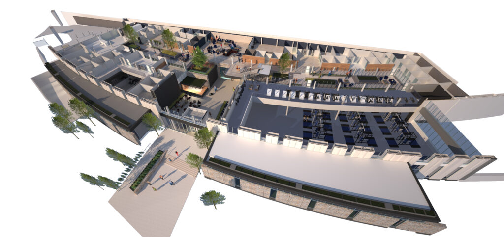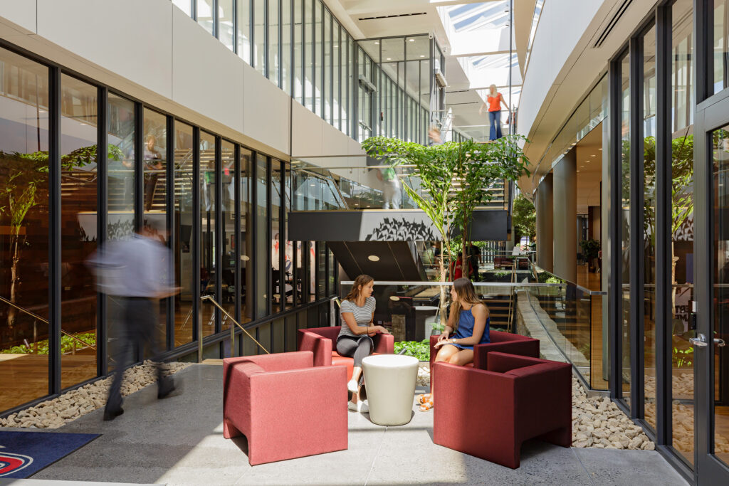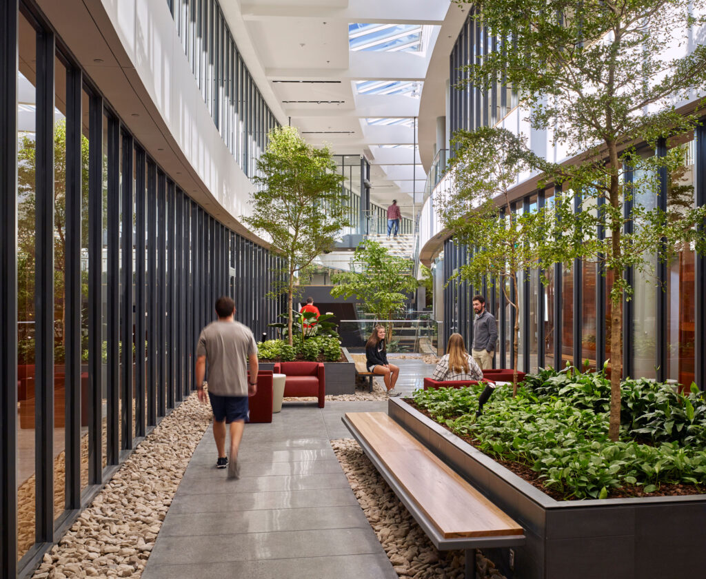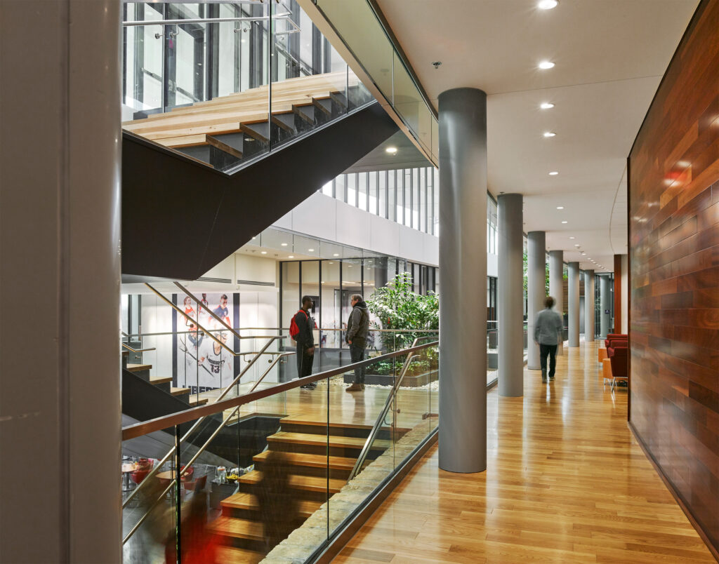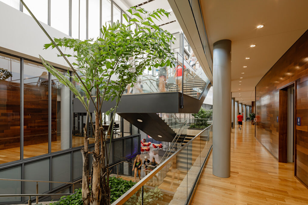 At the heart of the Athletics Center is the Garden Atrium. The unique site conditions and programmatic requirements demanded an organizational and sectional response implemented by a central atrium that allows abundant daylight deep into the space. The light-filled Garden Atrium is an open, central volume that extends multiple stories – allowing trees, plants, and people to thrive in the natural daylight and fresh air within the building. In addition to the fresh air and abundant views, the length and depth of the multi-story Garden Atrium encourage healthy daily routines, like walking and taking the stairs.