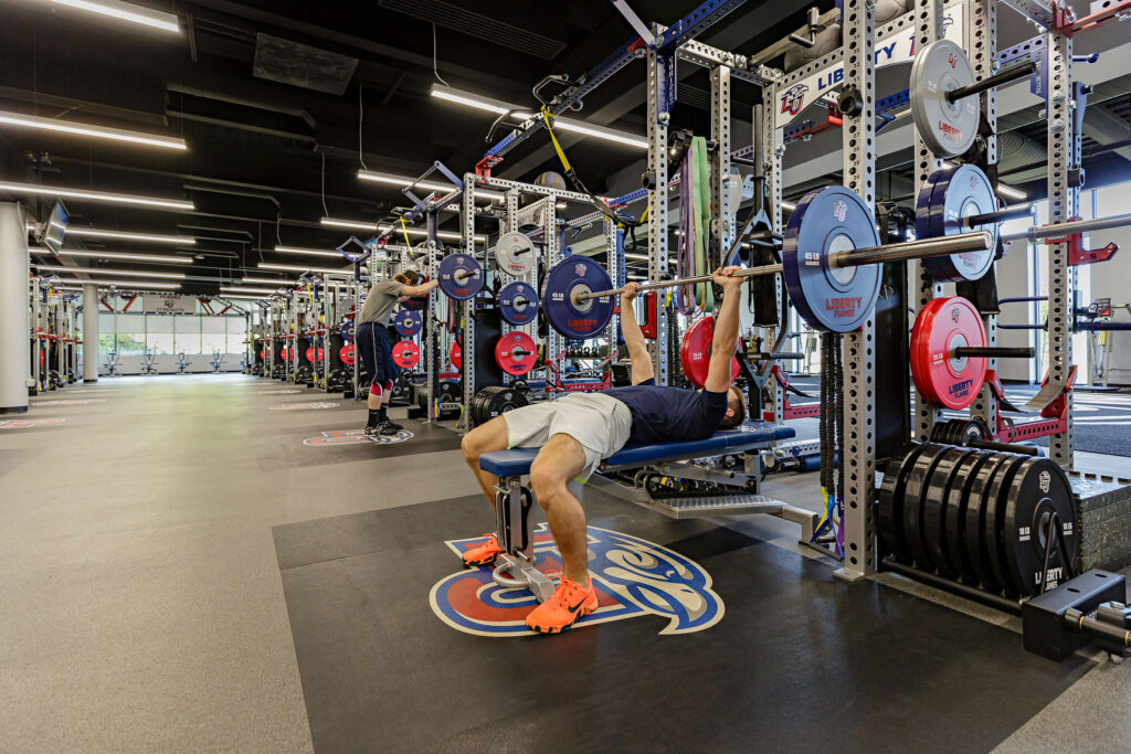 Liberty University’s Athletics Center is a multi-use athletic facility designed for the holistic health, rehabilitation, and education of student-athletes in their NCAA Division-1 sports programs. The facility integrates all the main components of a student-athlete’s full development including fitness and training rooms, academic tutoring and study spaces, and administrative services for coaches and staff. Bringing all these services under one roof created a well-grounded environment at the heart of Liberty’s Athletics Corridor.