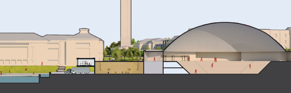 The Basketball Practice Center is a 47,000 SF, three-level addition to Liberty University’s main arena, the Vines Center. The facility connects all three levels of the Vines Center, where VMDO also completed locker room renovations and updates to the arena’s weight room. The Basketball Practice Center includes two practice courts, each with side courts for basketball and volleyball. In addition, a green roof originating at the practice facility serves as a pedestrian bridge linking future academic courtyards to future residential courtyards.