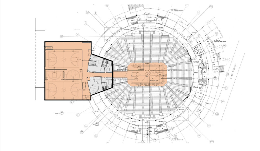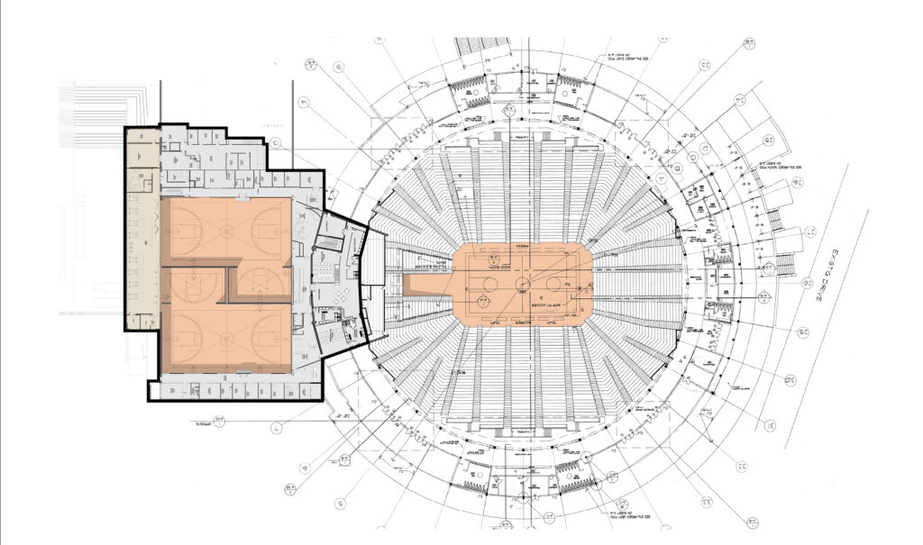 The Basketball Practice Facility is a three-level addition to Liberty University’s main arena, the Vines Center. The practice facility includes two practice courts, each with side courts for basketball and volleyball.