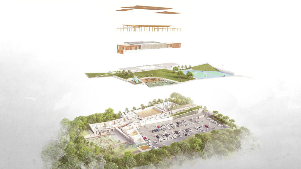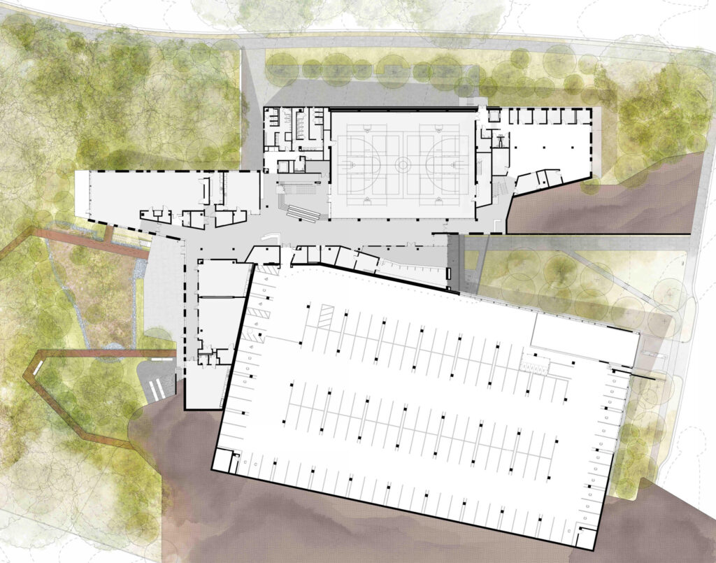 The 50,000 sf replacement structure includes multipurpose rooms for recreation programs, a fitness center, a gymnasium, a preschool program, community meeting rooms, a kitchen, reception and office space for county-wide Parks and Recreation staff. Outdoor programmed and open recreation spaces include a playground, a volleyball and basketball court, covered gathering space, and improvements to site circulation and streetscape.
