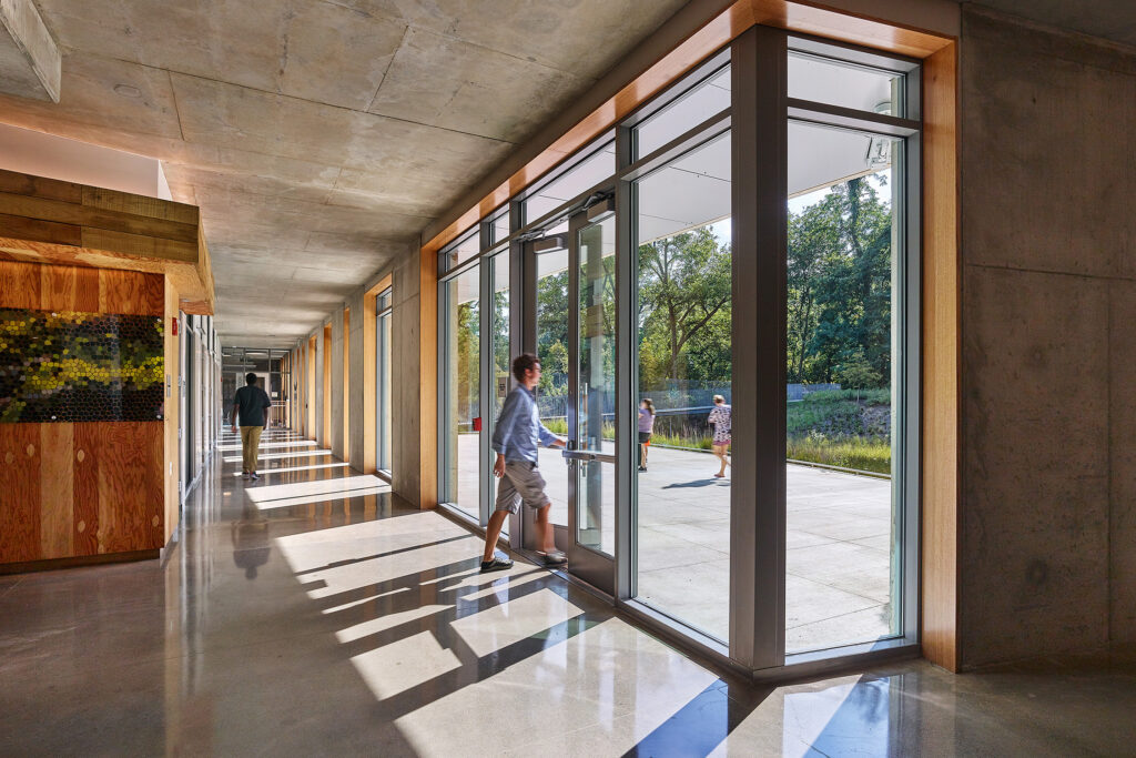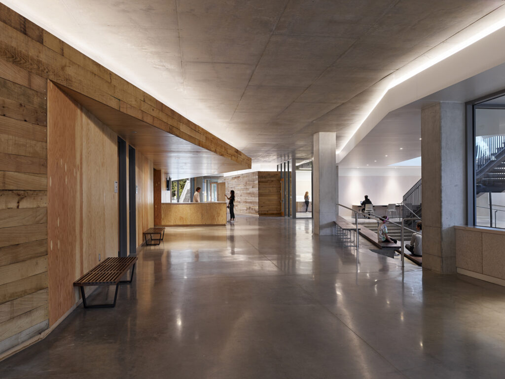 In terms of material use, experimentation with a Thermawall system increases the project’s energy performance while decreasing the number of materials. The project also uses a glue-laminated wood structure above grade, which reduces the project’s embodied energy and provides biophilic benefits to building occupants. Trees that were felled during construction were milled and used to clad the primary circulation pathways inside.