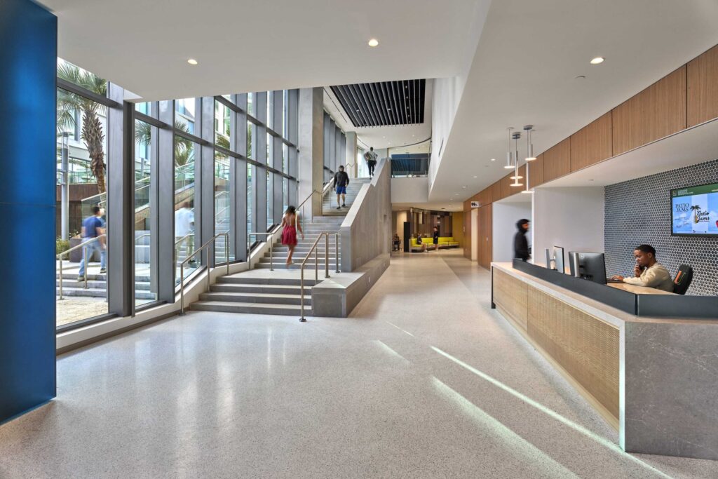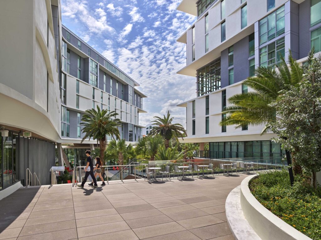 The architectural expression of Centennial Village draws inspiration from the rich modernism of campus, the local and international style and culture of Miami, and the institutional aspiration of hemispheric leadership. The building form curves in response to Lake Osceola, creating an undulating effect by pairing the slender ends of buildings with the gentle bends of the facades. Resident floors extend out over transparent ground-level gathering spaces, revealing the activity of shared spaces and enticing others to join.
