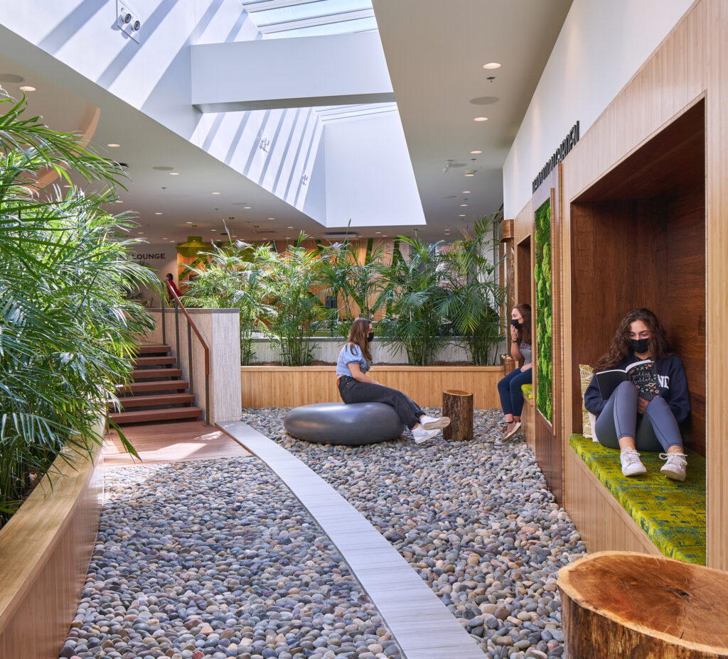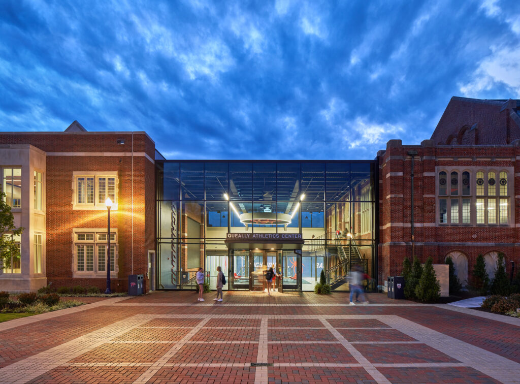 The Queally Athletics Center is a state-of-the-art home for training and performance for the basketball programs. The facility builds on the university’s commitment to collegiate sport and exudes principles of integrity and perseverance to athletes and staff. More than just a place for practicing, the courts are training spaces that allow players to exercise and hone their game. Next door, the Well-Being Center houses the Student Health Center, Counseling and Psychological Services, and health promotion and nutrition services. This integrated location allows students to seek care, be proactive about their health, and enjoy sport in one place. Effective arrangements of multi-disciplinary program spaces combined with an abundance of daylight, interior gardens, healthy food options, and natural materials enhance the spirit of well-being in the building and around campus.