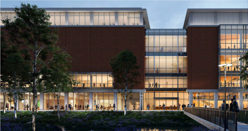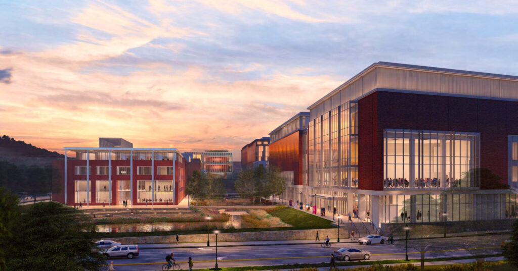 Expected to open in 2029, the Center for the Arts celebrates fine arts and performing arts at the University of Virginia and in the surrounding community. This new facility serves an important role in defining a new academic and cultural magnet for the Ivy Corridor Development. Clad in red brick and large expanses of glass with cast stone accents, the building offers a contemporary interpretation of the historic material palette on Grounds.