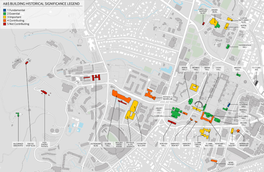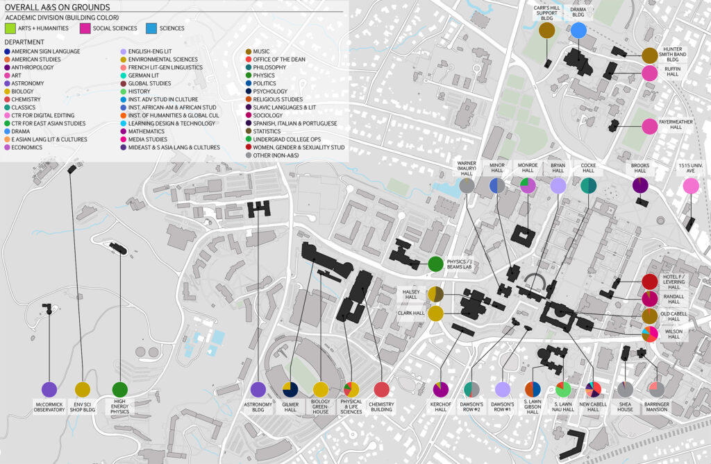 The space study included findings, recommendations, and estimated costs and the development process focused on about 50 core buildings and engaged about 60 academic/admin units (individually and in groups). These findings are built upon known This project assessed current spaces, created the future vision, conducted a current/future gap analysis, and created a playbook of future opportunities for physical, programmatic, and operational changes considering the College of Arts and Sciences academic and administrative spaces – quantifying surpluses and deficits, providing a rationale for location on and off-grounds, and preliminary costs associated with recommendations such as to renovate, relocate, or expand. Rather than a prescriptive plan, this is a flexible playbook with prioritized projects that the College can implement as funding/opportunities arise. This comprehensive study will serve as a guide for developing academic space on Grounds for years to come.