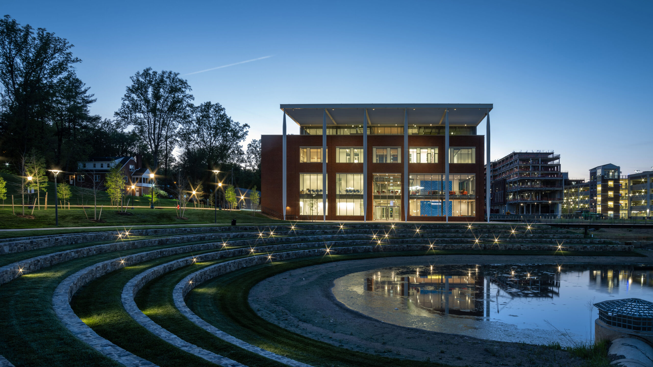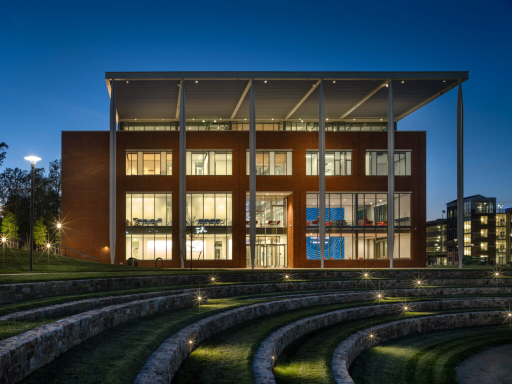 Data Science is an interdisciplinary field that uses scientific methods, processes, and systems to extract knowledge and insights from data. Guided by goals to further discovery, share knowledge, and make a positive societal impact, the School of Data Science sets the academic tone for the University of Virginia’s Emmet-Ivy Corridor development. The building, a collaboration between VMDO and Hopkins Architects, occupies a prime corner site with an amphitheater and a retention pond between the main façade and the street.