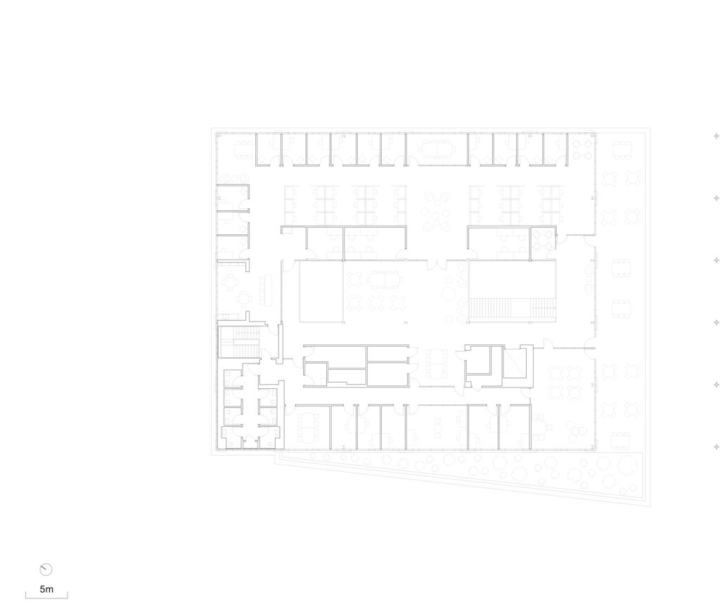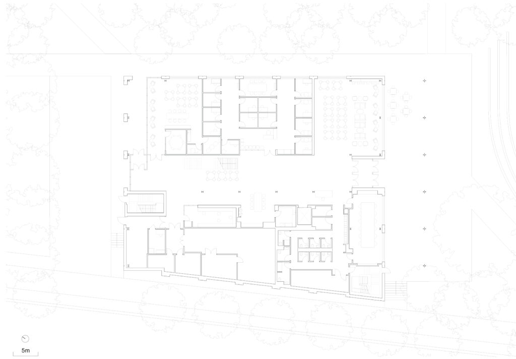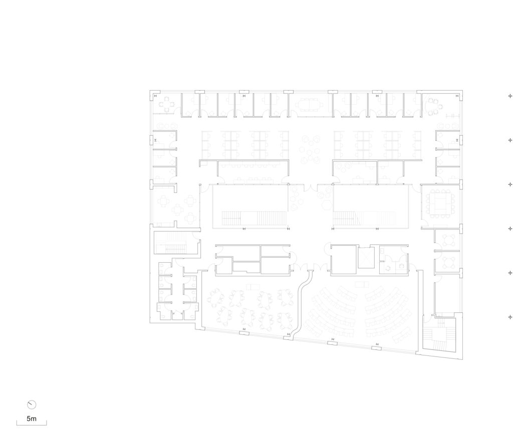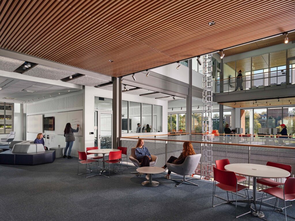 In keeping with the University’s 2030 sustainability goals, a green roof is incorporated at the fourth floor to mitigate heat gain from the south. Private offices are designed with operable windows that open to increase natural ventilation. Despite the cutting-edge nature of its program, the building seamlessly connects to the historic Grounds through material choices and coloring. The project is a significant step in defining the next chapter of the University of Virginia by supporting its newest forms of academic program and encouraging its mission for transdisciplinary interaction across the student body.