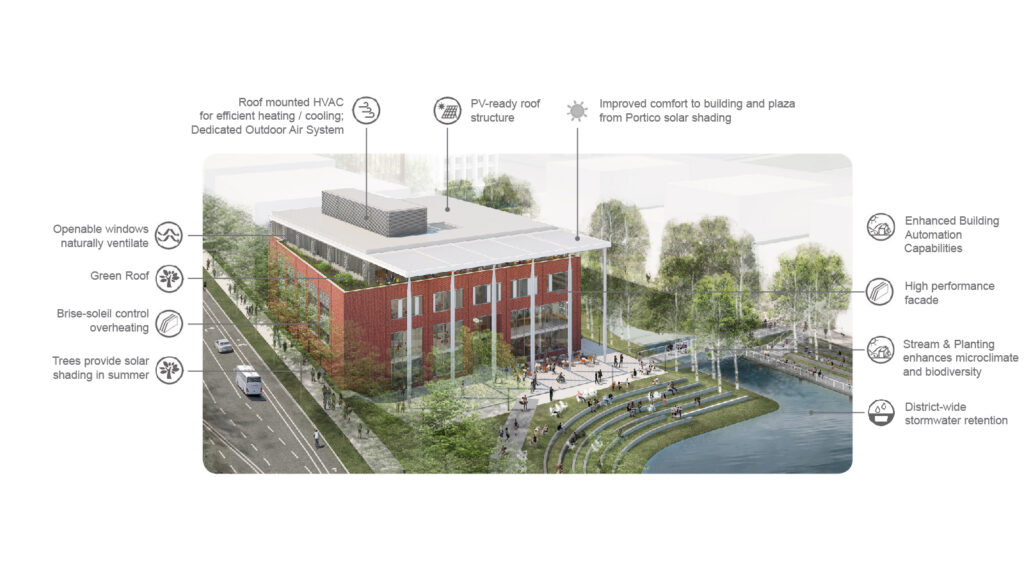 This building and the program are a realization of the tenets of the development principles for the Discovery Nexus and will uphold the promise for the vitality of the new Emmet/Ivy District. The integrated landscape, with the storm water pond, amphitheater, and promenade providing civic connectivity, while the building provides a new model for active teaching, putting data science on display. Living up to its aspirational mission, this “School Without Walls” is building community by enabling collaboration and innovation in a state-of-the-art academic facility.