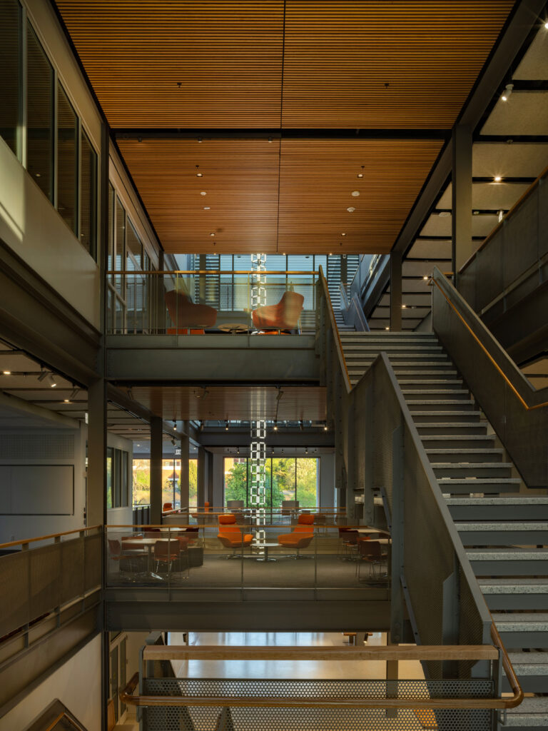 The building encourages the connection and community-building inherent to the burgeoning scientific field. In addition to four active learning classrooms, the new facility includes faculty offices, meeting spaces, and research areas that support the new field of study. A double-height interior space allows for the hosting of lectures and other events. The upper story is a completely glazed lantern that provides dramatic views of the surrounding campus.