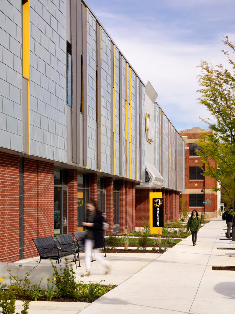 Referencing the neighborhood context, vertically articulated red brick and zinc tiles evoke textures from adjacent buildings. Perforated metal panels provide solar-shading and glare control, and create a dynamic focal point as visitors arrive. Brick, glass, and slate wrap the ground floor entrance spaces, further connecting VCU athletics to its urban context.