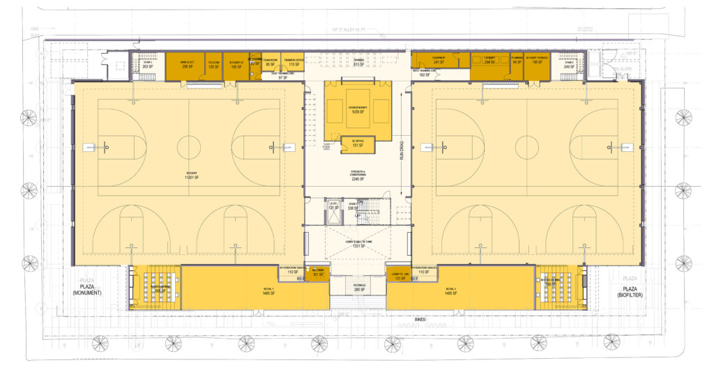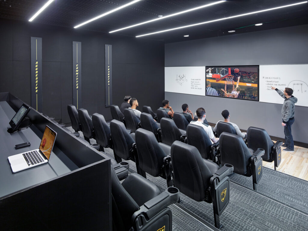 The basketball practice courts are the heart of the new facility and are available day and night for players and coaches to hone their craft. The courts are conceived not only as ‘practice’ spaces, but also as ‘training’ and ‘education’ spaces. Dedicated zones outside the playing boundaries accommodate aerobic and resistance training equipment. Film rooms adjacent to the court offer the ability for teams to flow effortlessly from film room to practice floor without significant down-time.