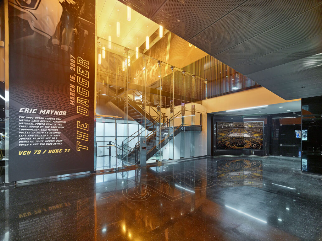 Interior spaces resonate with the passion and energy of the VCU men’s and women’s basketball programs. In the public spaces, a rich palette of terrazzo flooring, wood paneling, perforated metal, and glass provides a powerful backdrop for the VCU story conveyed throughout the facility. The second floor team areas transition to a more youthful architectural character, reflecting the contemporary materiality and aesthetics appealing to recruits and players.
