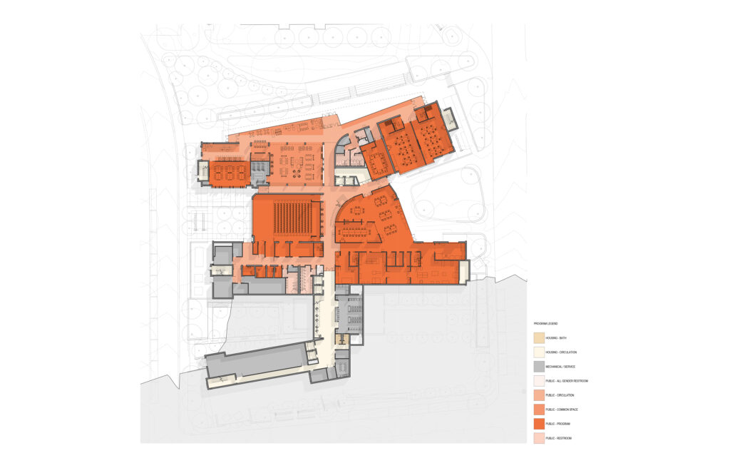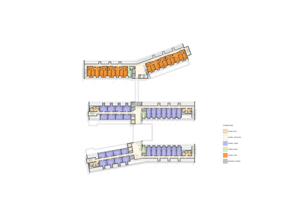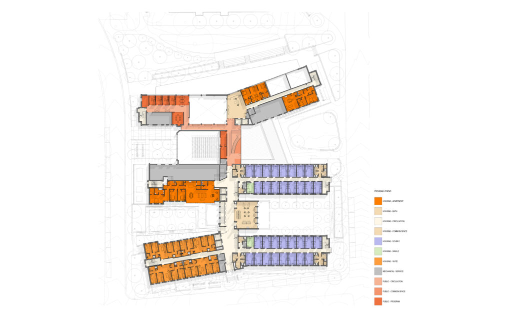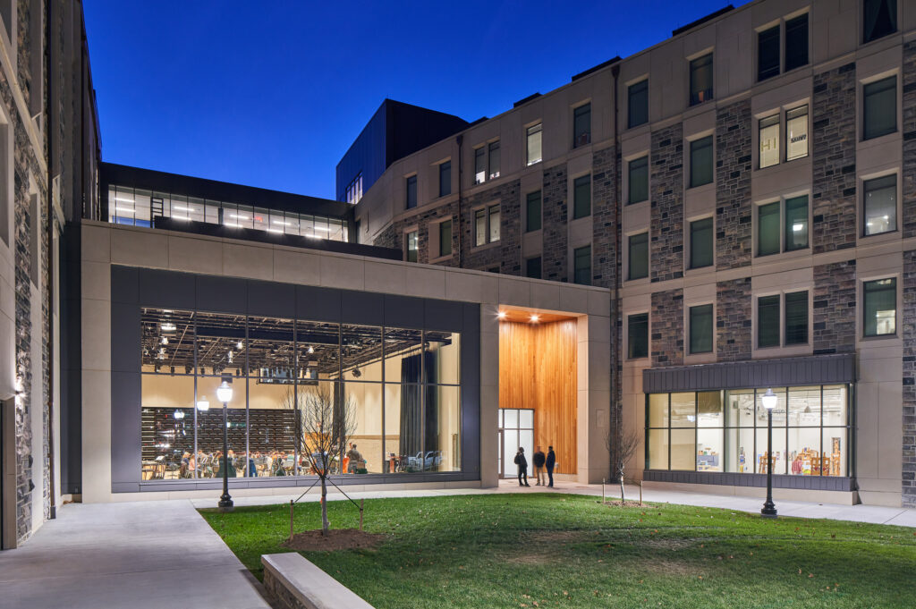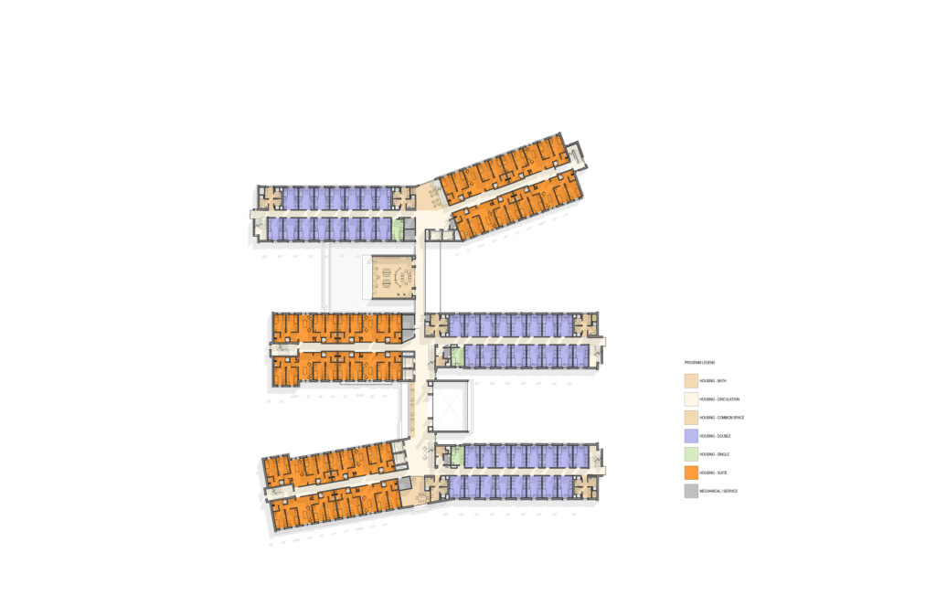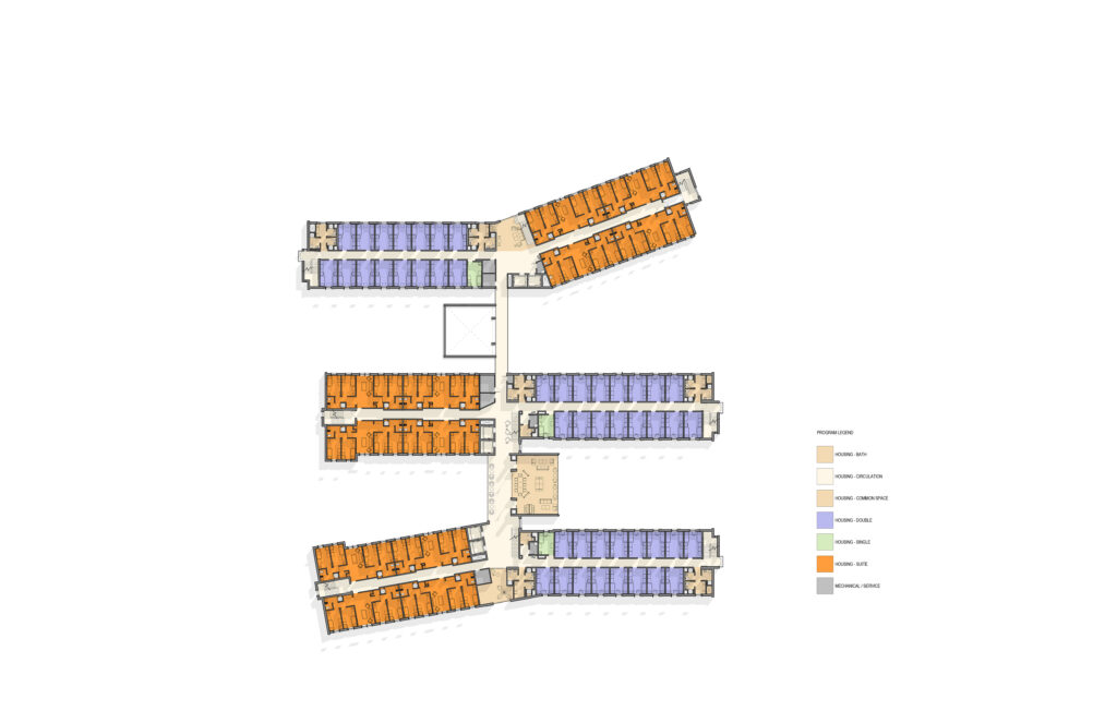 VMDO oversaw the design of the criteria documents for the 596-bed residence hall intended for students enmeshed in the CID and designed around two LLCs for the arts and entrepreneurship. The innovative living-learning community is open to students from all majors across campus who want to gain insight into the entrepreneurial process. Faculty apartments allow live-in professors to be fully immersed in the interdisciplinary activity in the district and engage with students in enriching ways. Common spaces and interconnected circulation encourage students to interact at every scale of the building and contribute to a high level of energy and engagement.